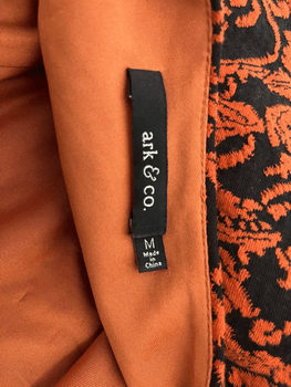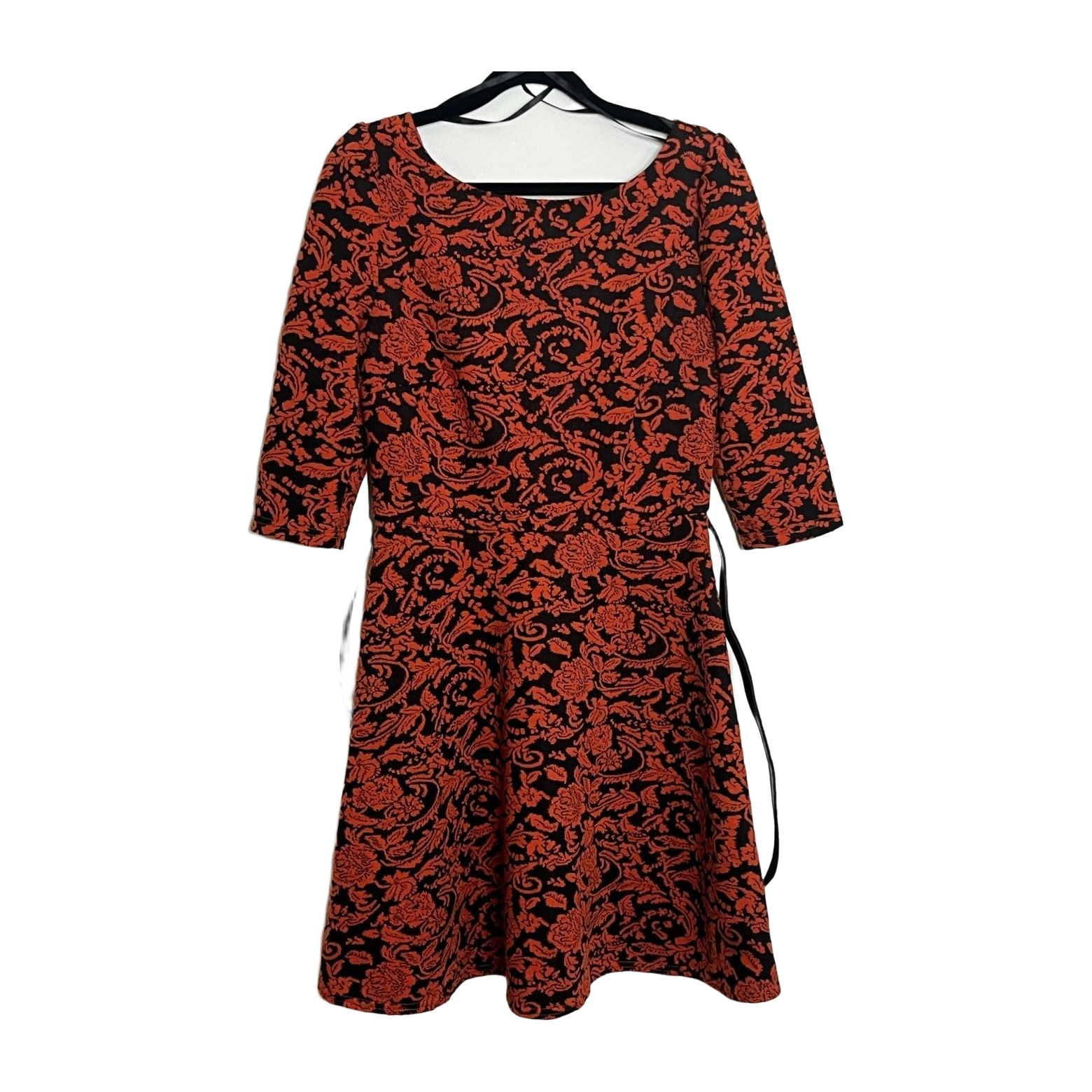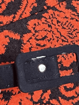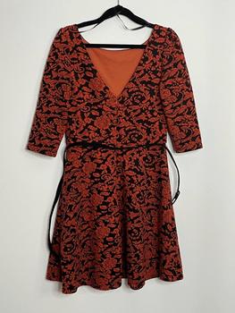 Knee length orange red dress with ornament/floral pattern. Size M. Good pre-owned condition, some wear on the belt but it can easily be changed. Puffed 3/4 sleeves, hidden zipper closure, lined. Soft and a little bit streachy fabric. Measurements: shoulders 37cm, chest 42cm, waist 35cm, item length 39cm.
