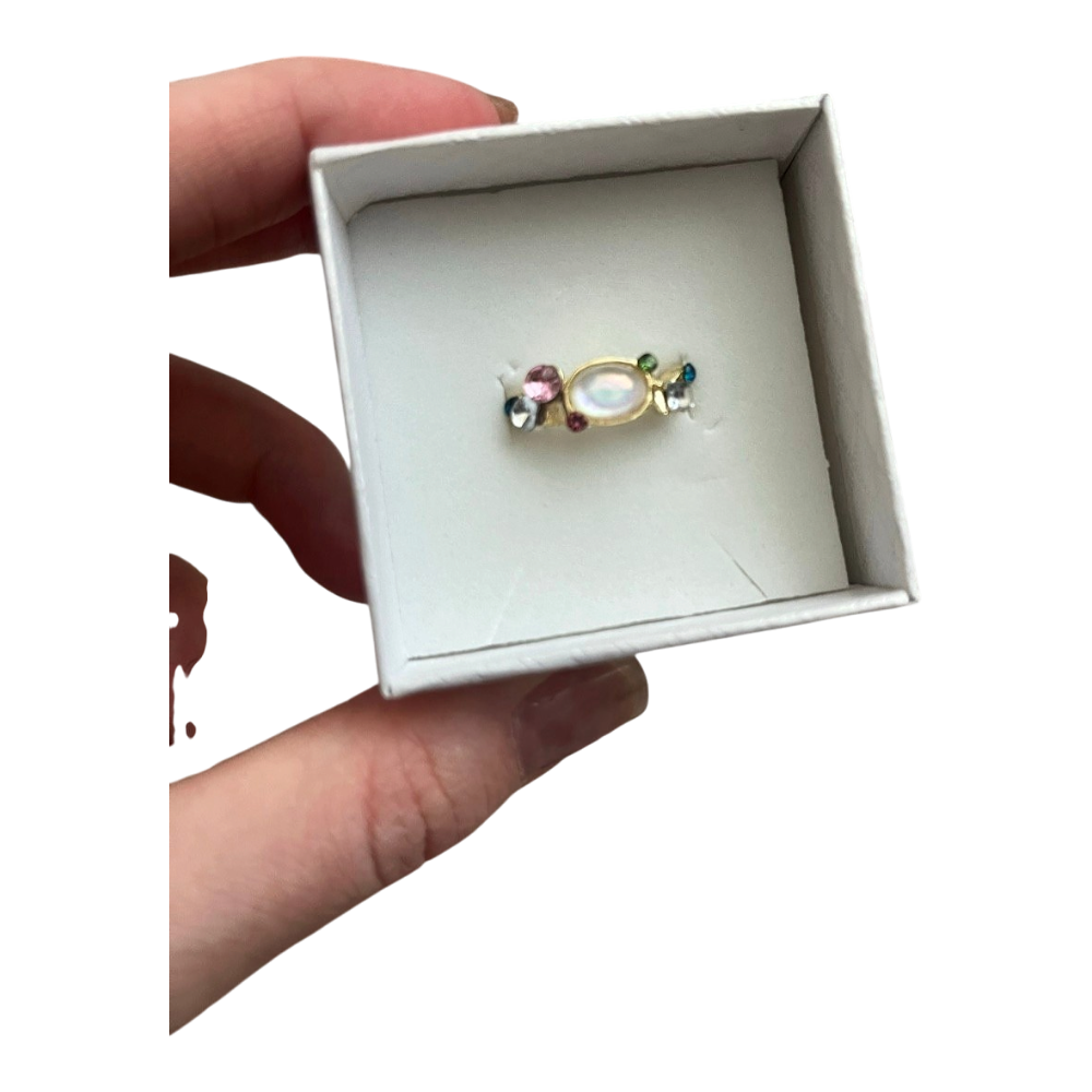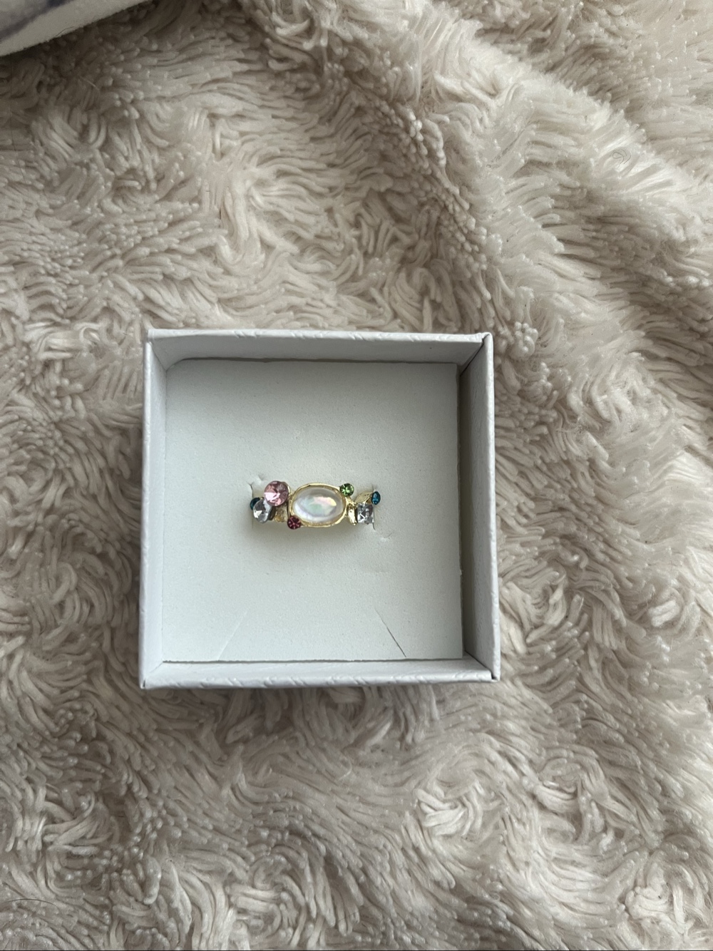 Gold-toned ring with a clear center stone and small decorative stones in different colors.