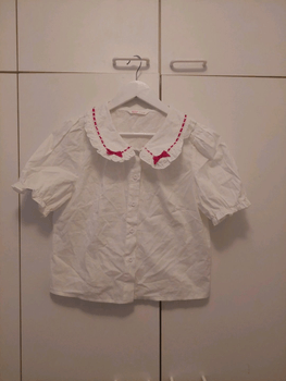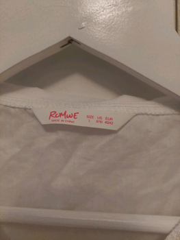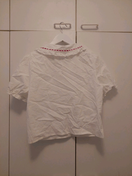 Short top. Wrinkled from storage. Unused. Size L, but for me slightly tight at the chest.