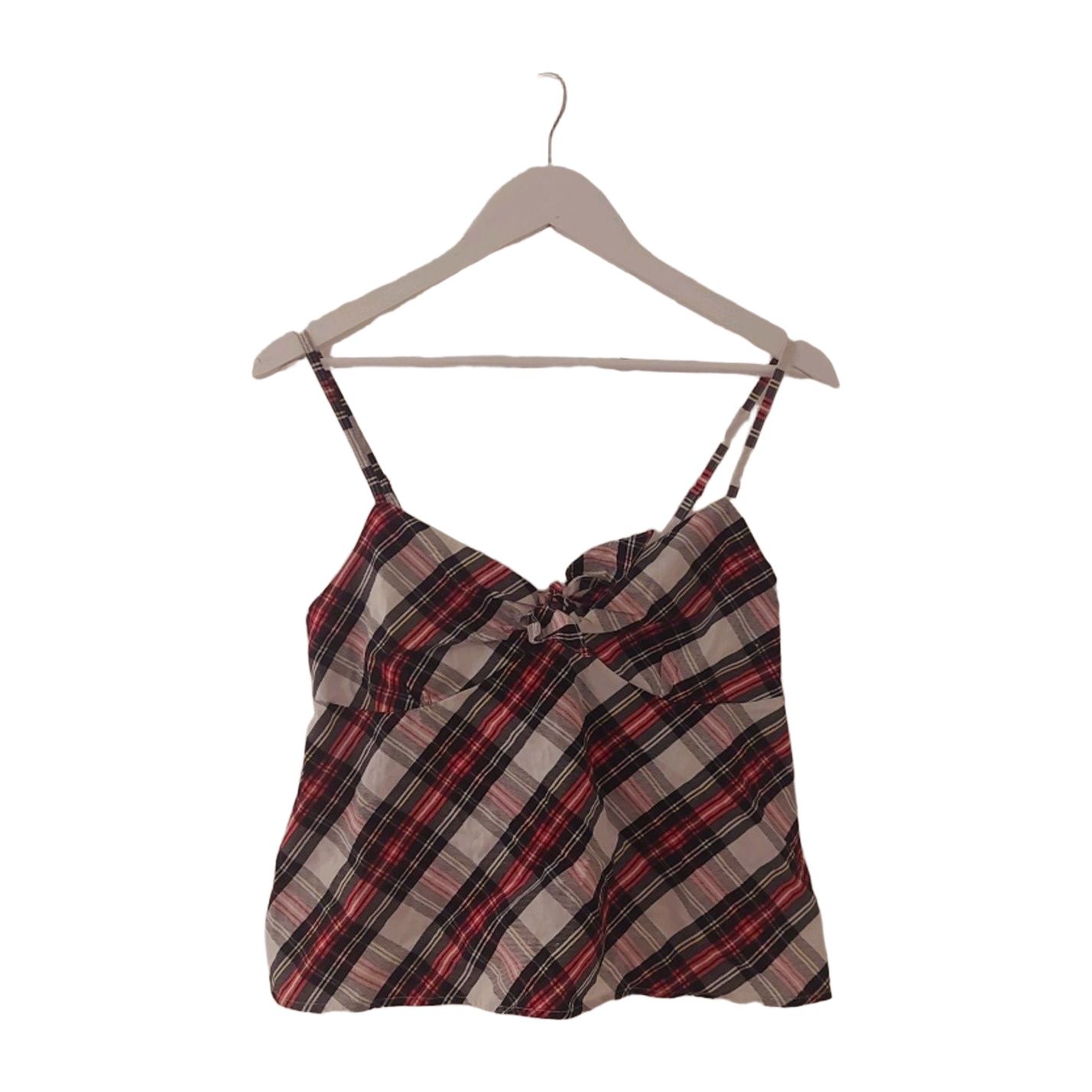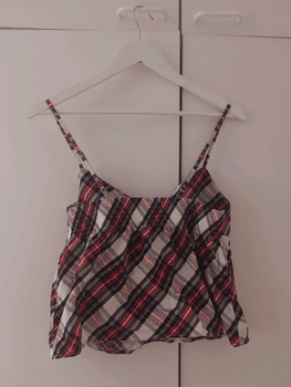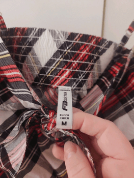 Checked top, bow at the front. The upper part is form-fitting, the lower part flares slightly. Free with any purchase.
