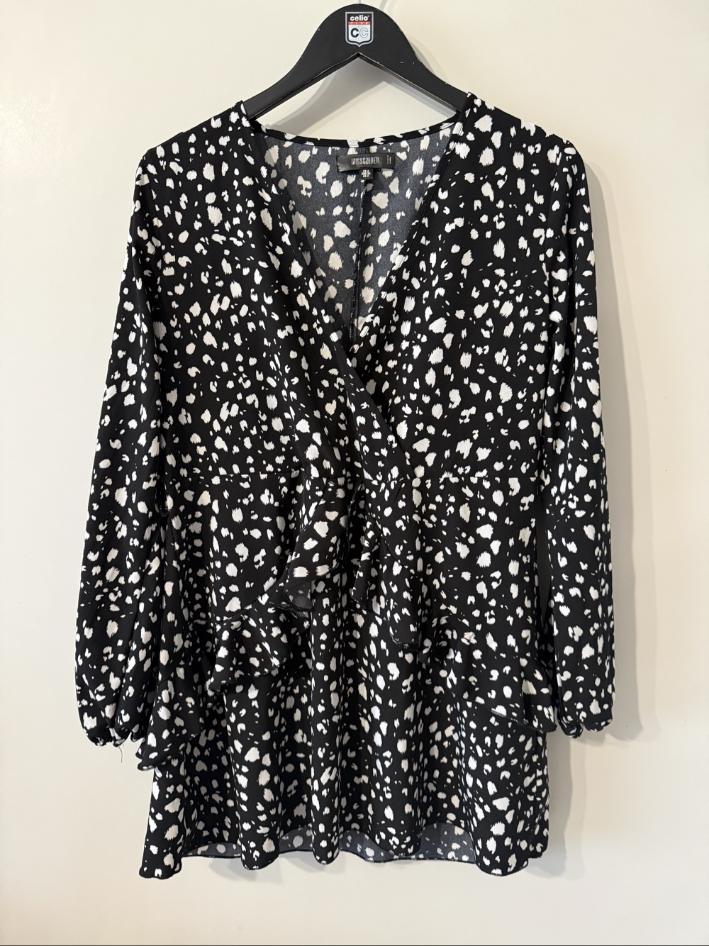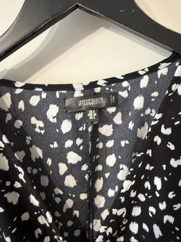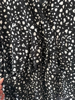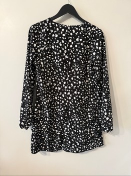 Black and white long-sleeved dress with a patterned print. Features a V-neckline and ruffled detailing. Size 36.