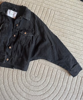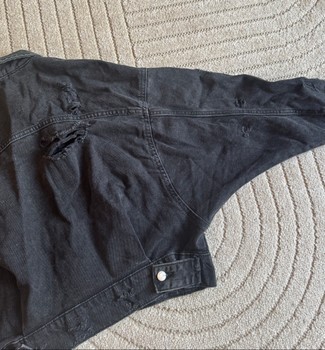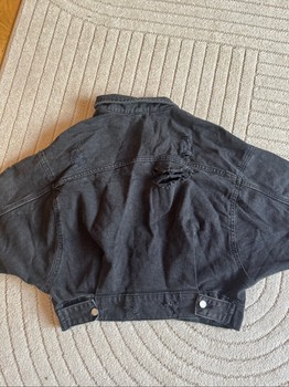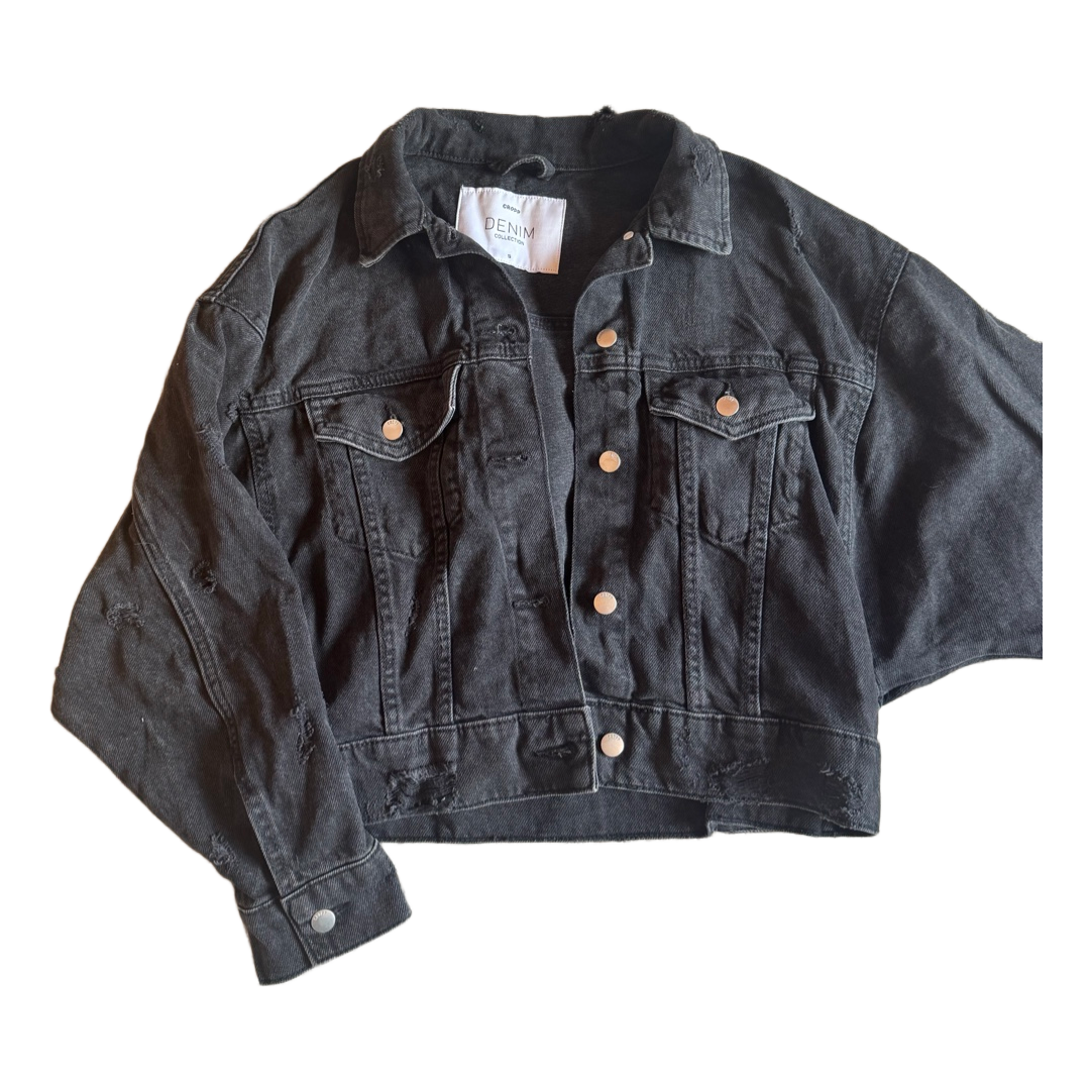 Cropped black denim jacket with a distressed finish. Features button closure and chest pockets. Size S. Oversized