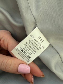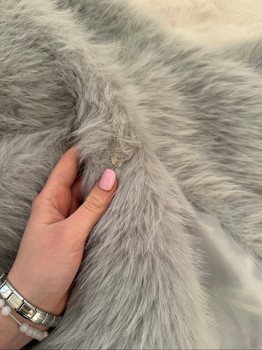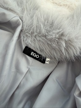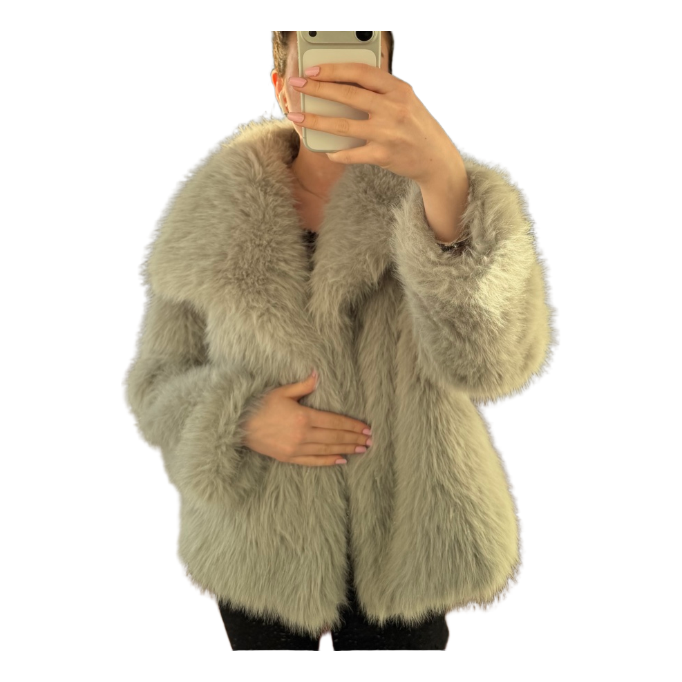 Grey faux fur jacket with a wide collar. Fully lined, made of 100% polyester. Size S.