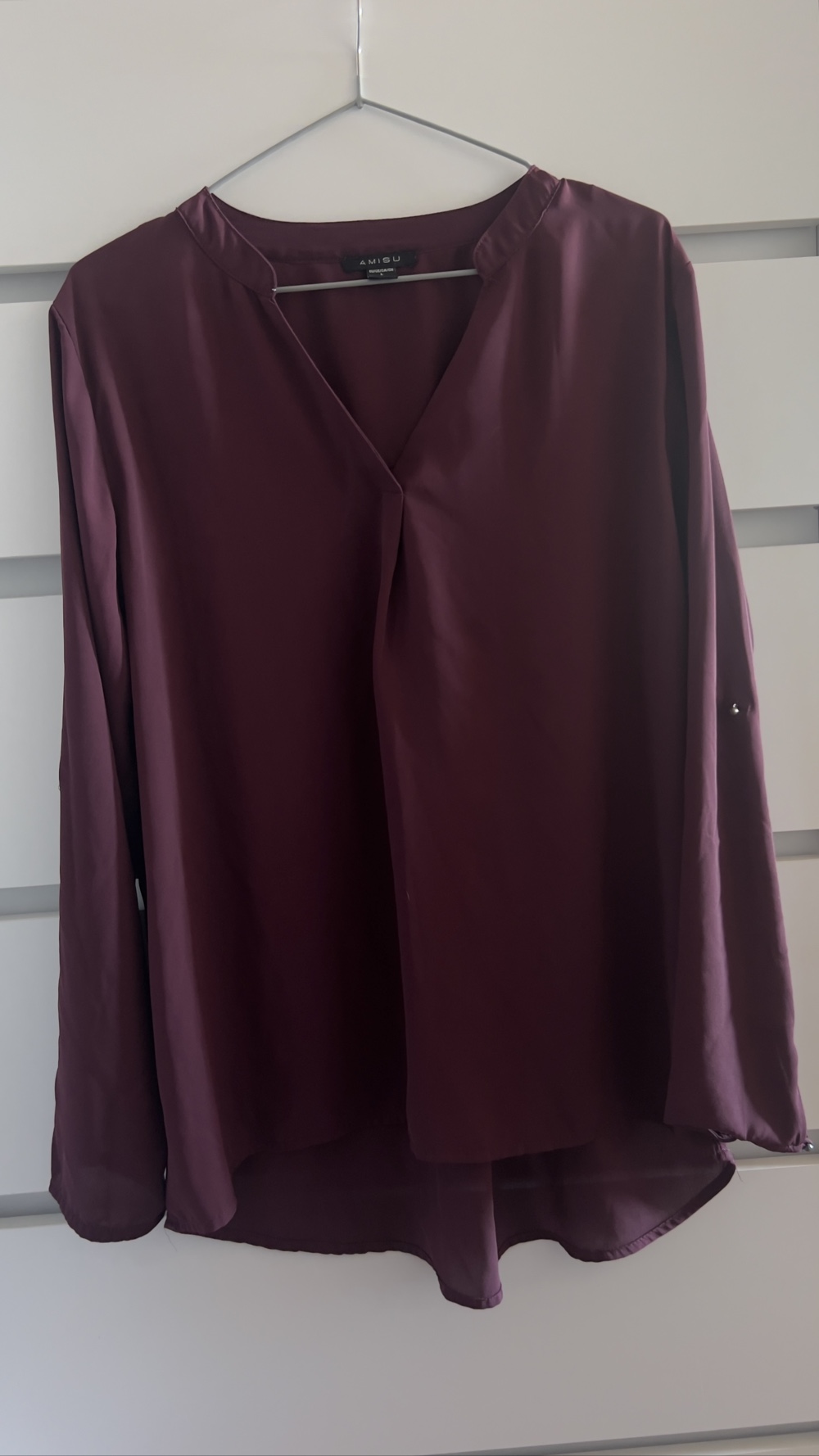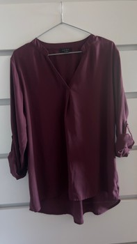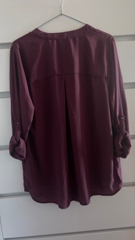 Burgundy blouse with roll-up sleeves and V-neckline. Size L.