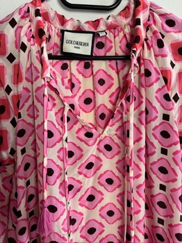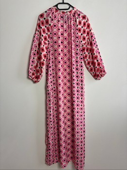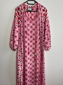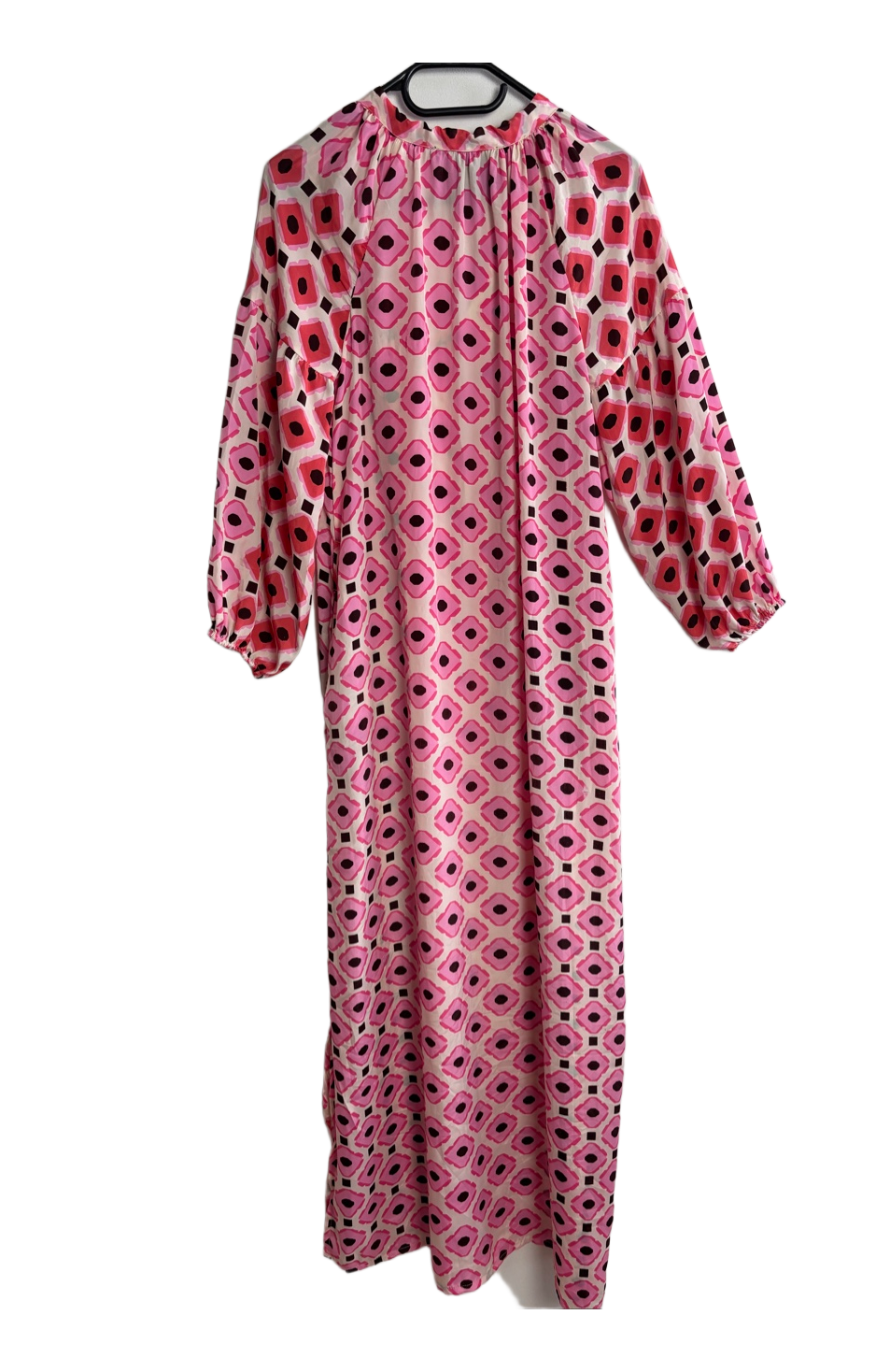 Long dress with a geometric pink and black pattern. Features tassel neck ties and long sleeves with elasticated cuffs.