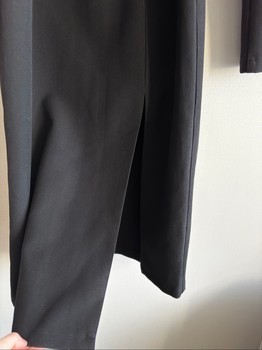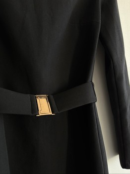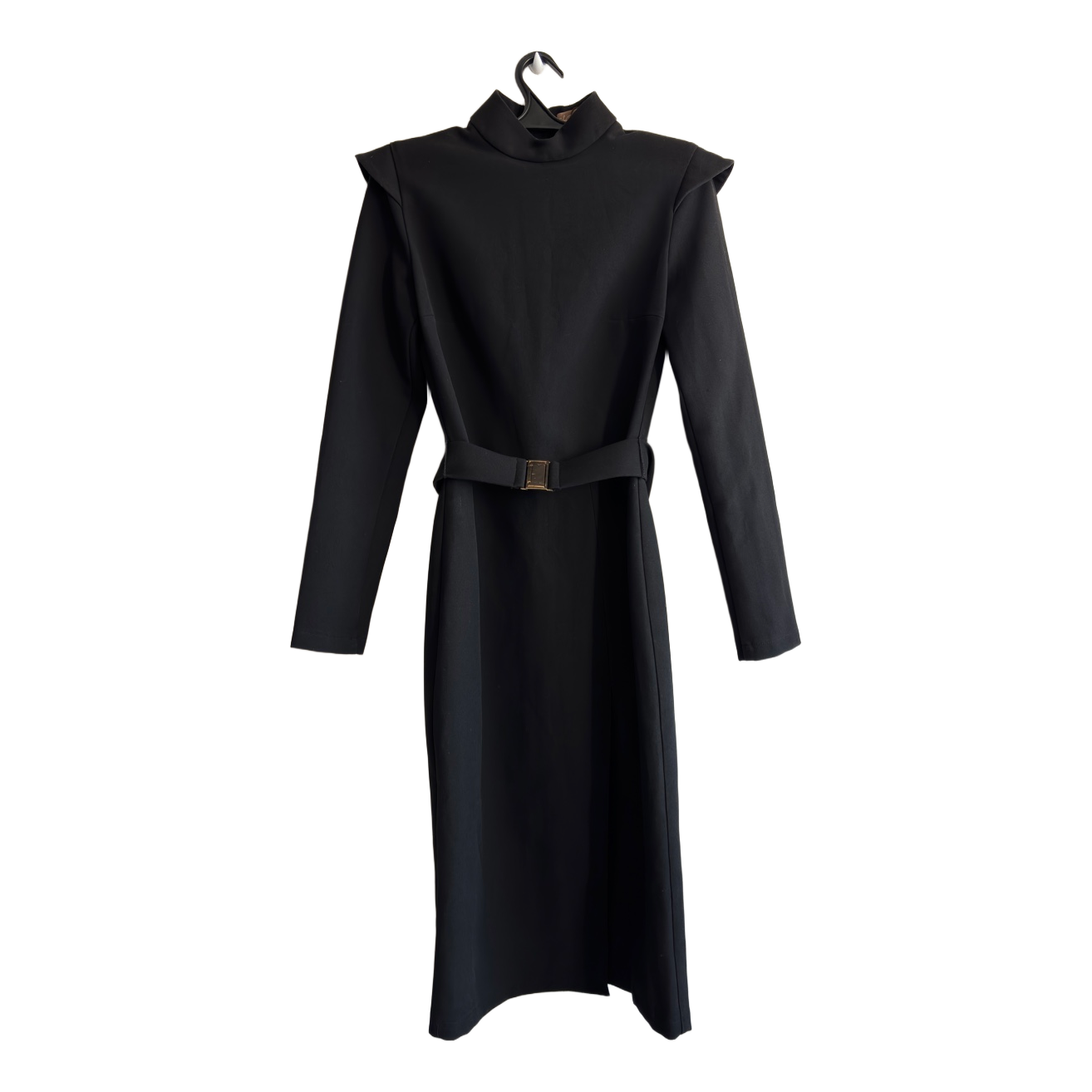 Black midi dress with a high neckline, long sleeves, and a matching belt with gold hardware. Features a slit at the hem. Size M. The original price is 335eur