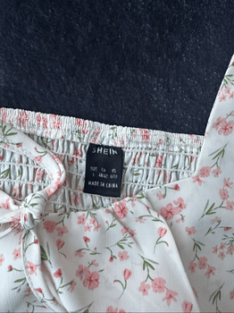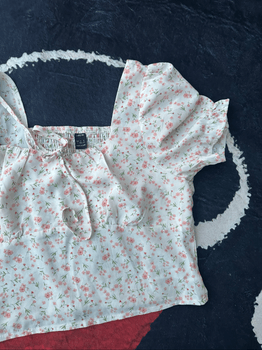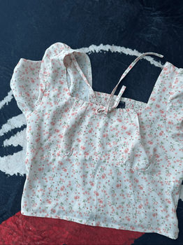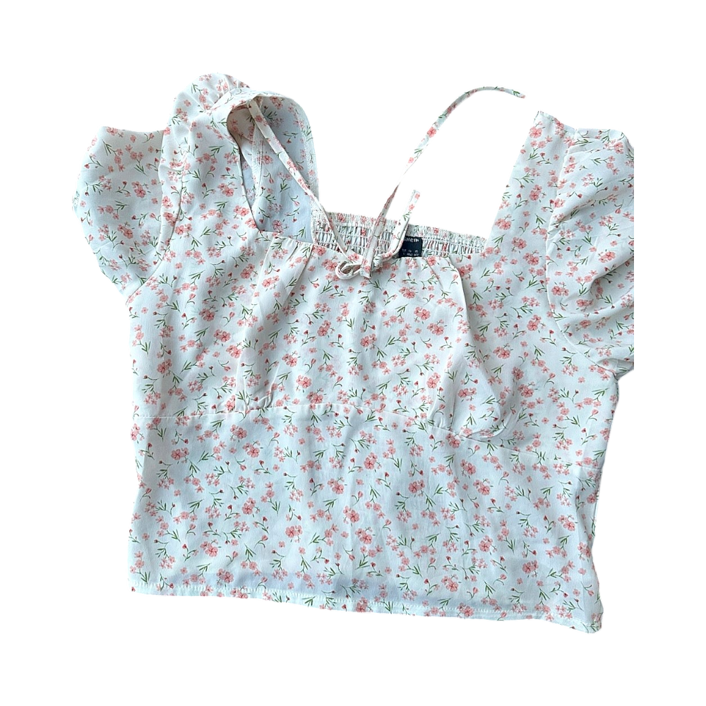 White top with pink floral print. Features short puff sleeves and a tie at the neckline. Elastic back for comfort.