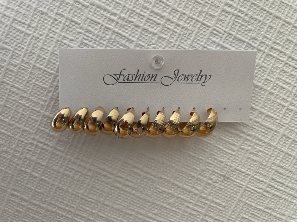 Set of multiple gold-toned hoop earrings with varied textures and cut-out designs. Includes earring backs. ‼️Can be bought separately at the price of just 2€