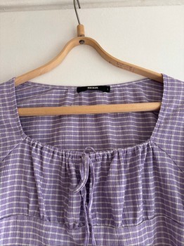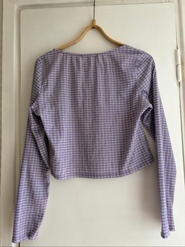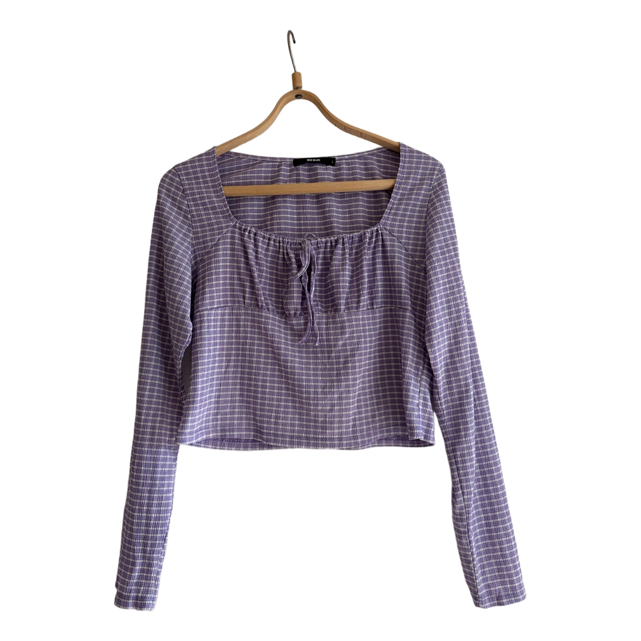 Purple long-sleeve top with a checkered pattern and a square neckline. Features a tie detail at the front. Size L. From bik bok