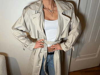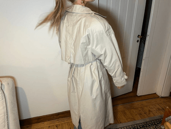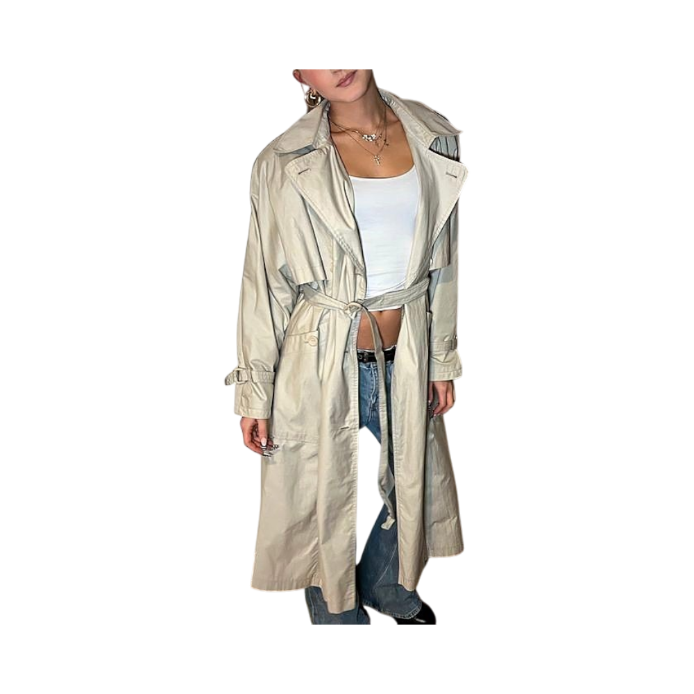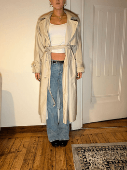 Beige trench coat with belted waist and button details. Oversized fit with classic collar and long sleeves.