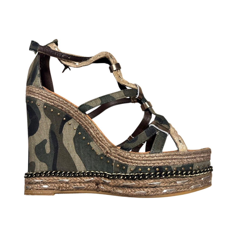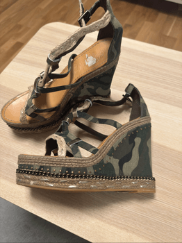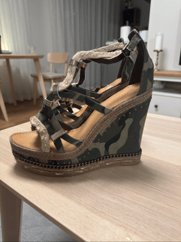 Heels with a camouflage pattern. Features strappy design and platform sole.