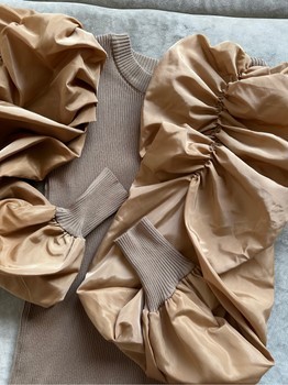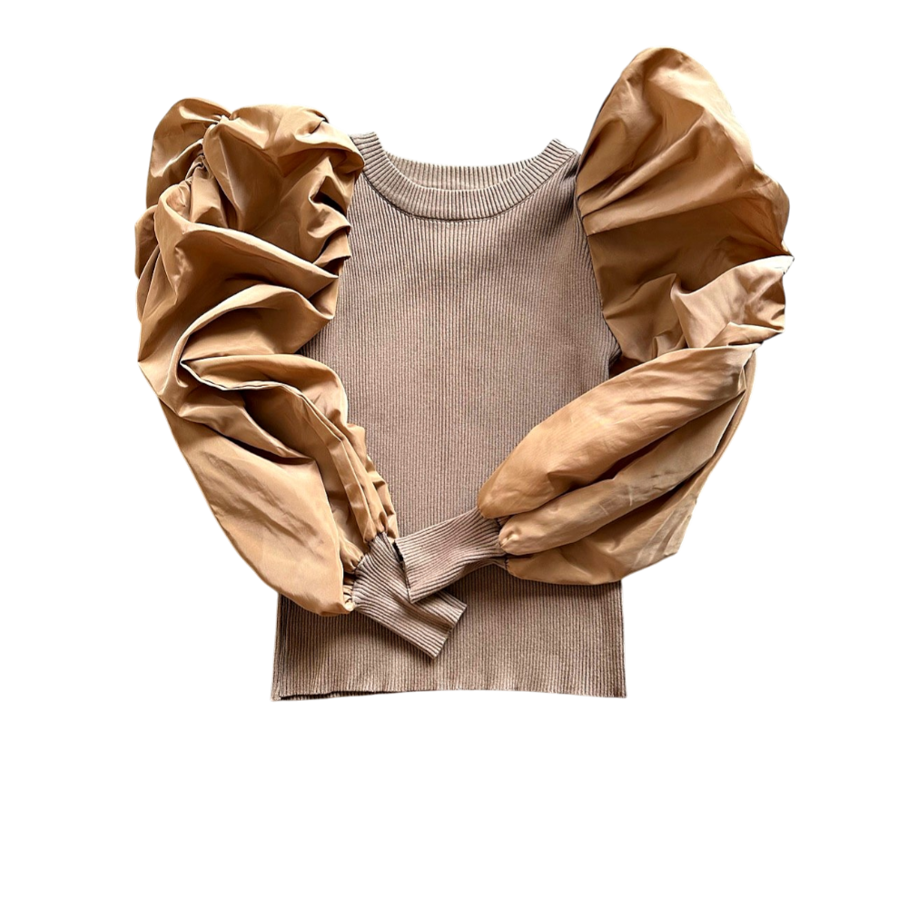 Beige ribbed sweater featuring voluminous sleeves in a contrasting fabric. Ribbed neckline and cuffs.