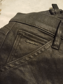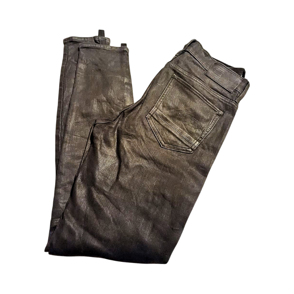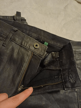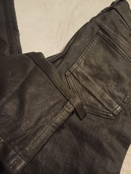 Skinny-style black jeans. Various details, such as a zipper on the side. Size and material not visible. Size estimated XS