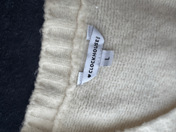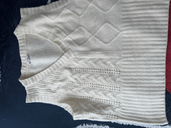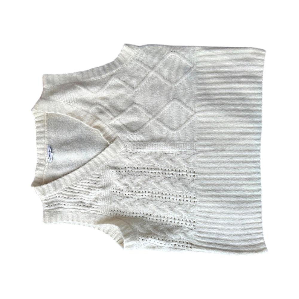 Beige knitted vest with diamond and cable pattern. Features a sleeveless design and ribbed hem. Size L.