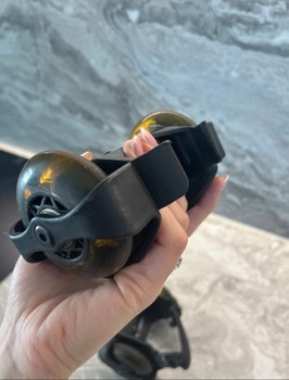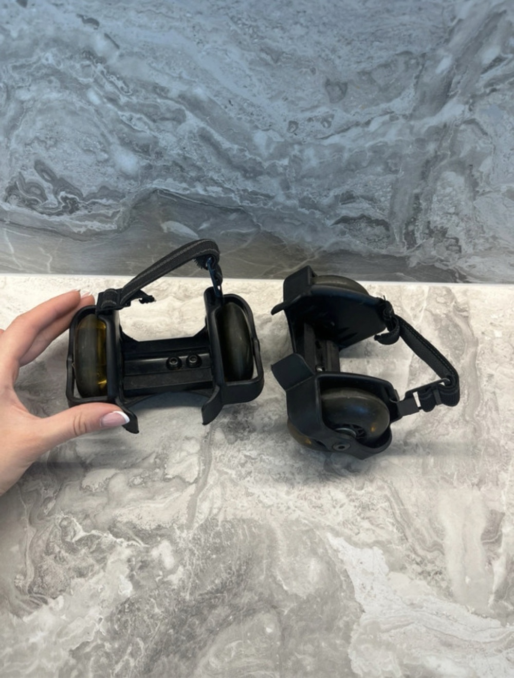 Black heel roller skates with adjustable straps. Designed for attachment to shoes. has scratches, one wheel shines minimally, the other does not shine.