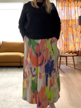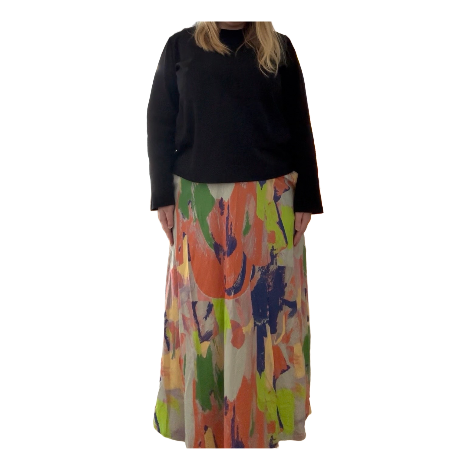 Domestic Aarre label's maxi skirt in lovely Wisdom Green print. Size L. Elastic waistband. Waist width unstretched approx 36 cm. Stretches to approx 51 cm. Length approx 90 cm. Very good condition. Worn a few times. No defects. Side pockets. RRP 99,90€.