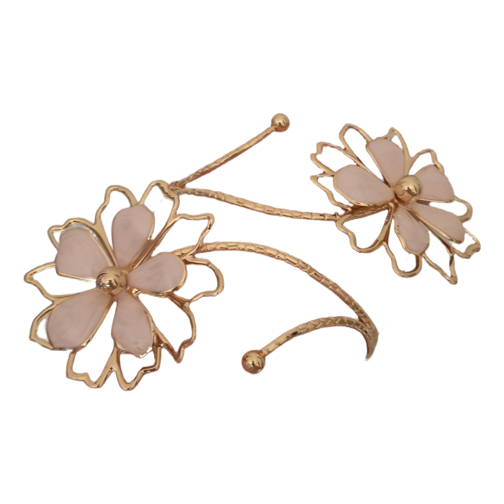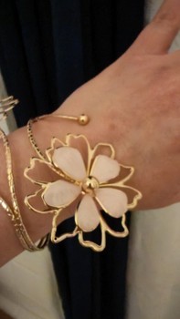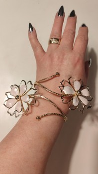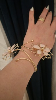 Golden bracelet, with two large flower-themed ornaments. Suitable to be used as anklet/upper-arm jewelry. Adjustable.
