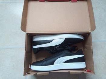 Black Puma sneakers with a white sole. Includes the original box.
