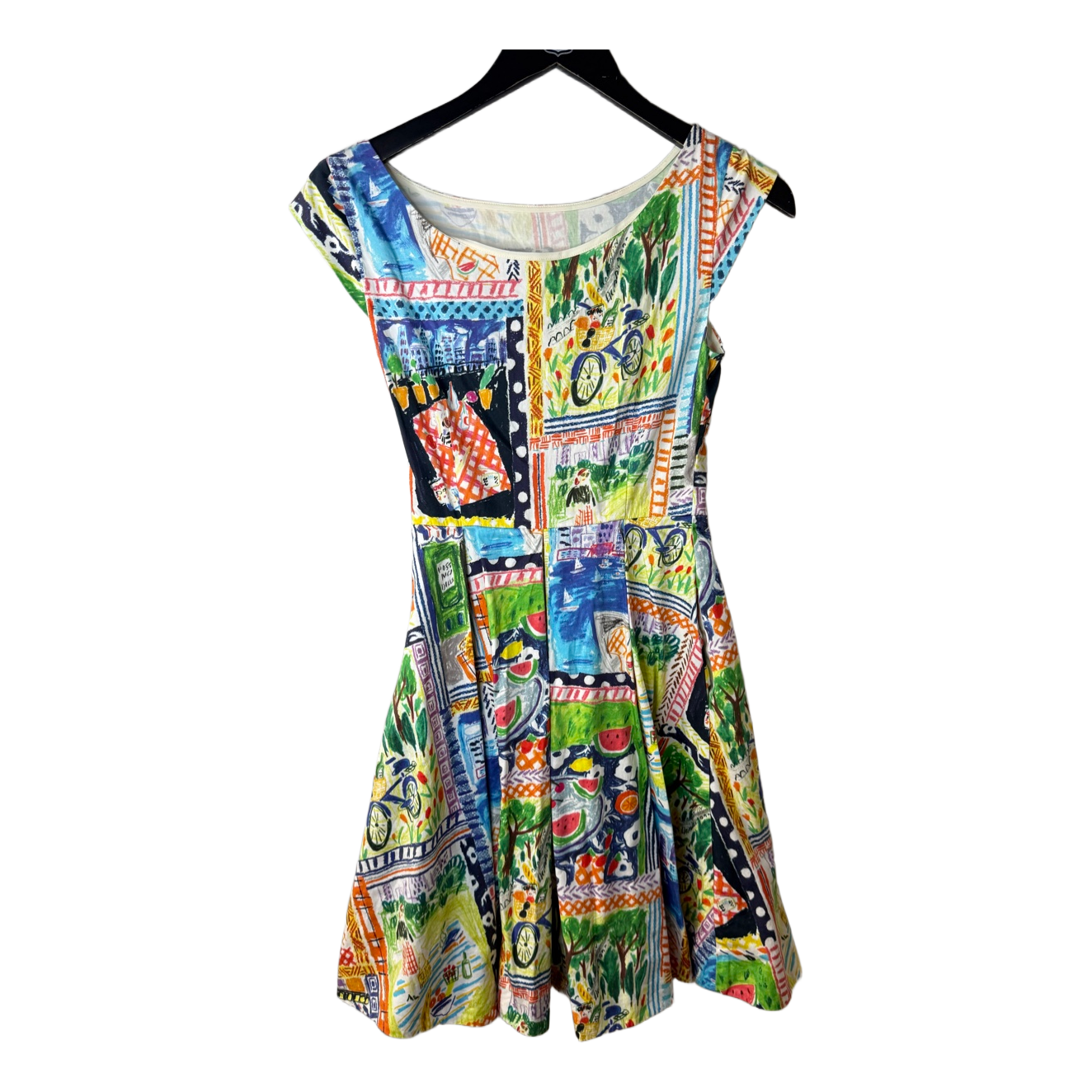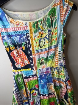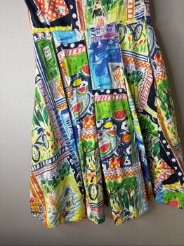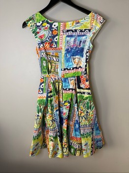 Midi length dress featuring a vibrant artistic print. The dress has cap sleeves, a rounded neckline, and side pockets.