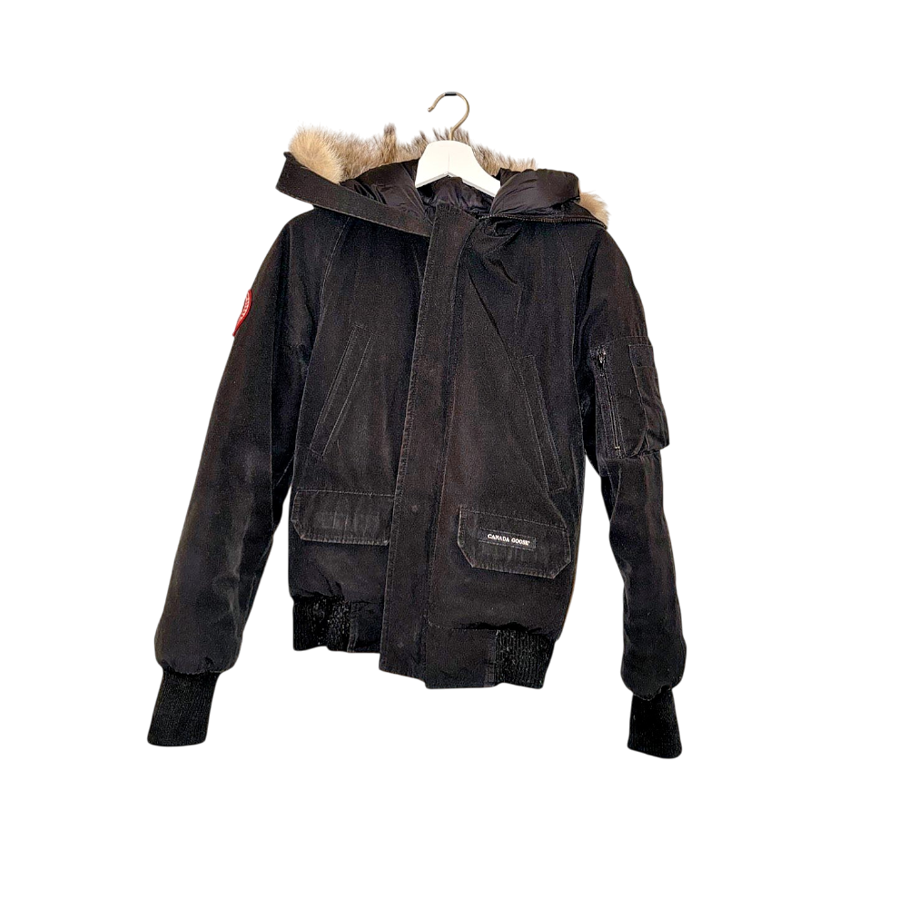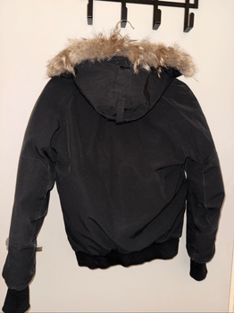 Black winter coat with fur-trimmed hood. Size small L. Bought from here a few years ago.