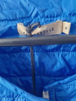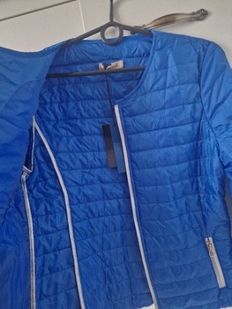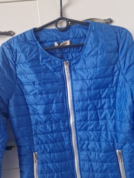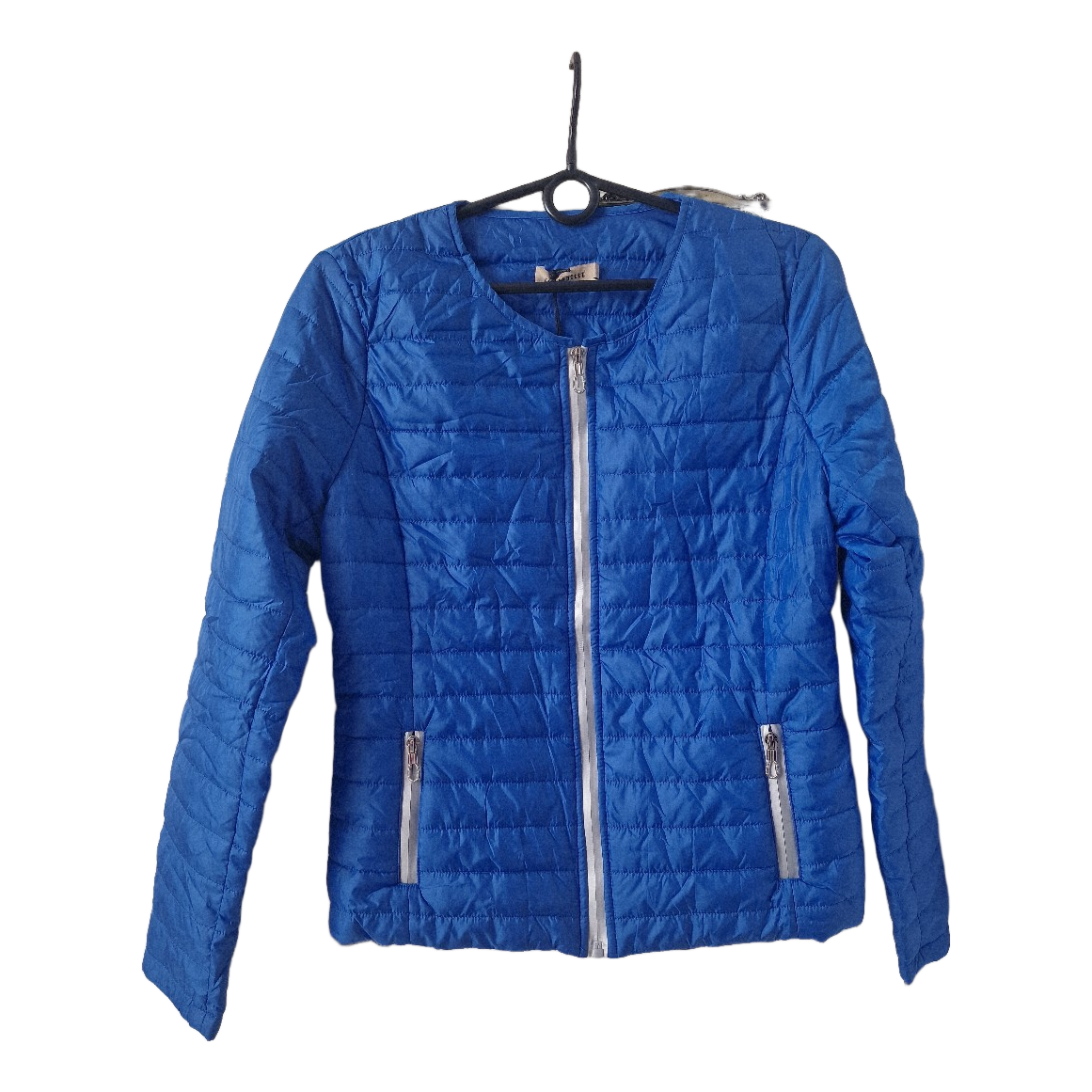 Blue quilted jacket with a zipper closure and side pockets. Features a rounded neckline. Size M.