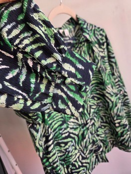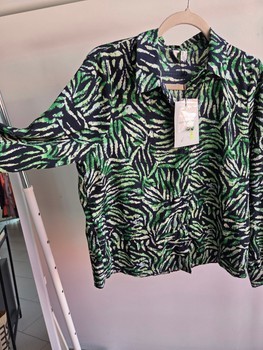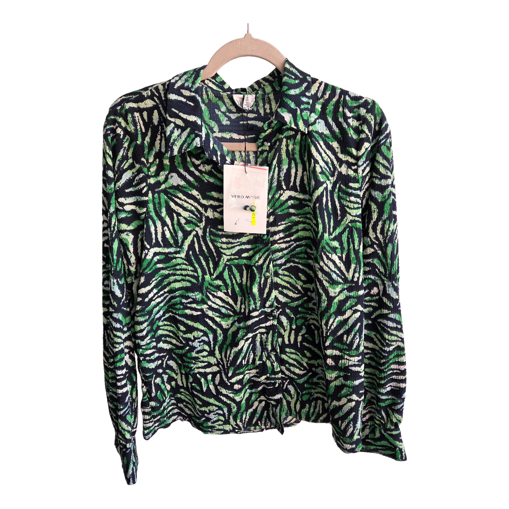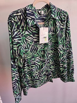 Green and black long-sleeved shirt with an abstract pattern and buttoned cuffs. Size M. New with tags.
