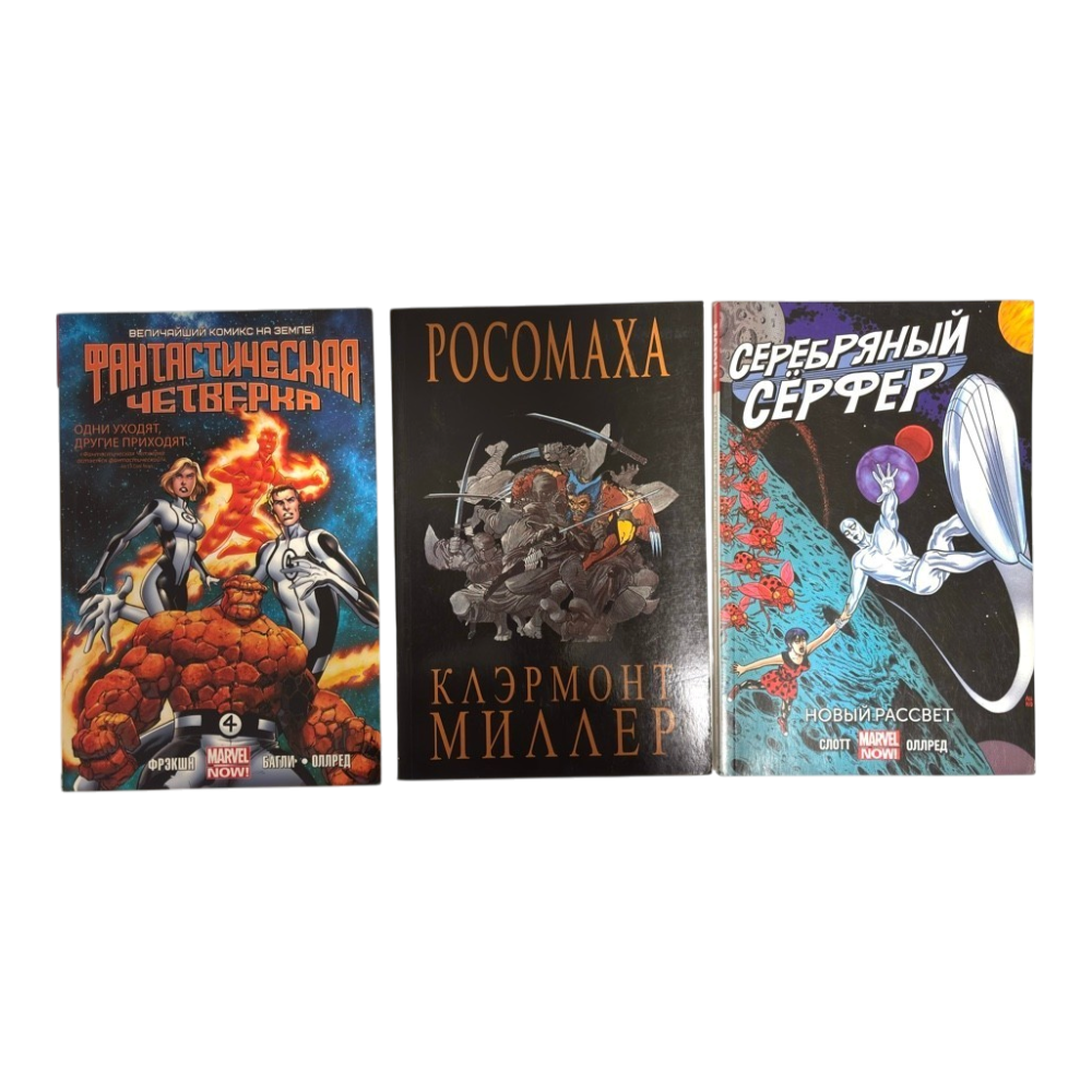 New Marvel comics (were bought in 2019): 1) Silver Surfer - New Dawn, vol. 1, 2016. €5 2) Fantastic Four - Some leave, others come, vol. 1, 2016. €5 3) Wolverine (Claremont, Miller), 2017. €5 Or all together for €12.
