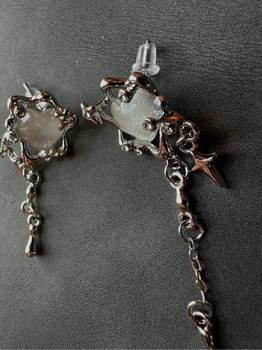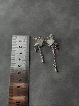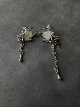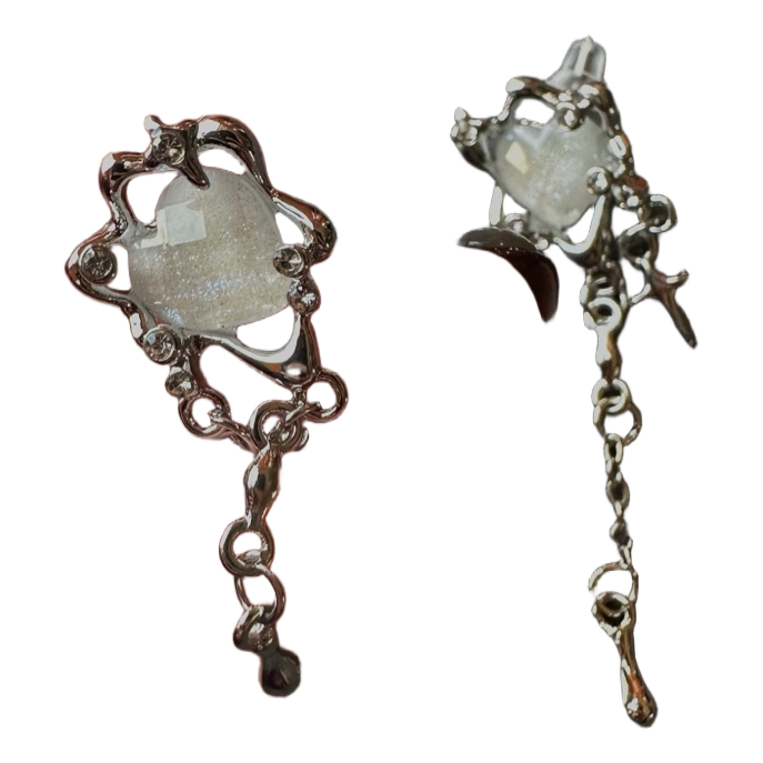 Silver-tone dangle earrings with heart-shaped glitter accents and chain detail.