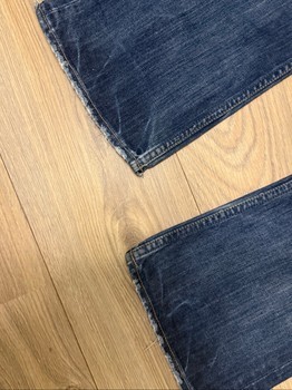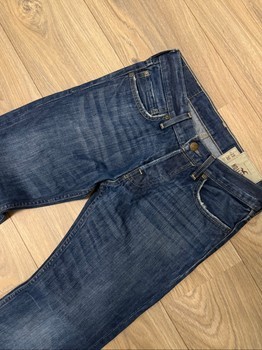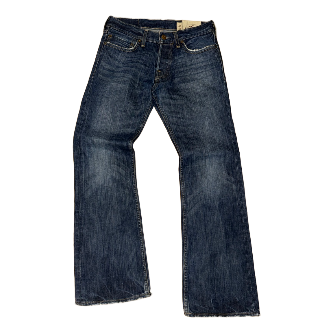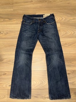 Blue denim jeans by Hollister with light distressing on the pockets and hem. Classic five-pocket style, size W28/L30.