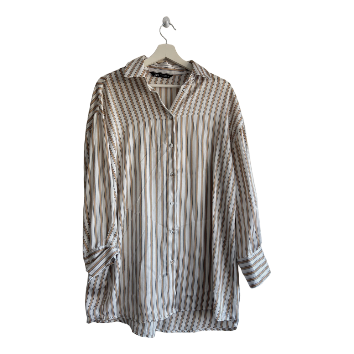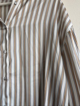 Beige and white striped shirt with long sleeves and front button closure. Size XS.