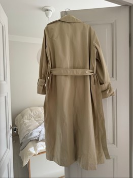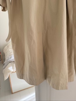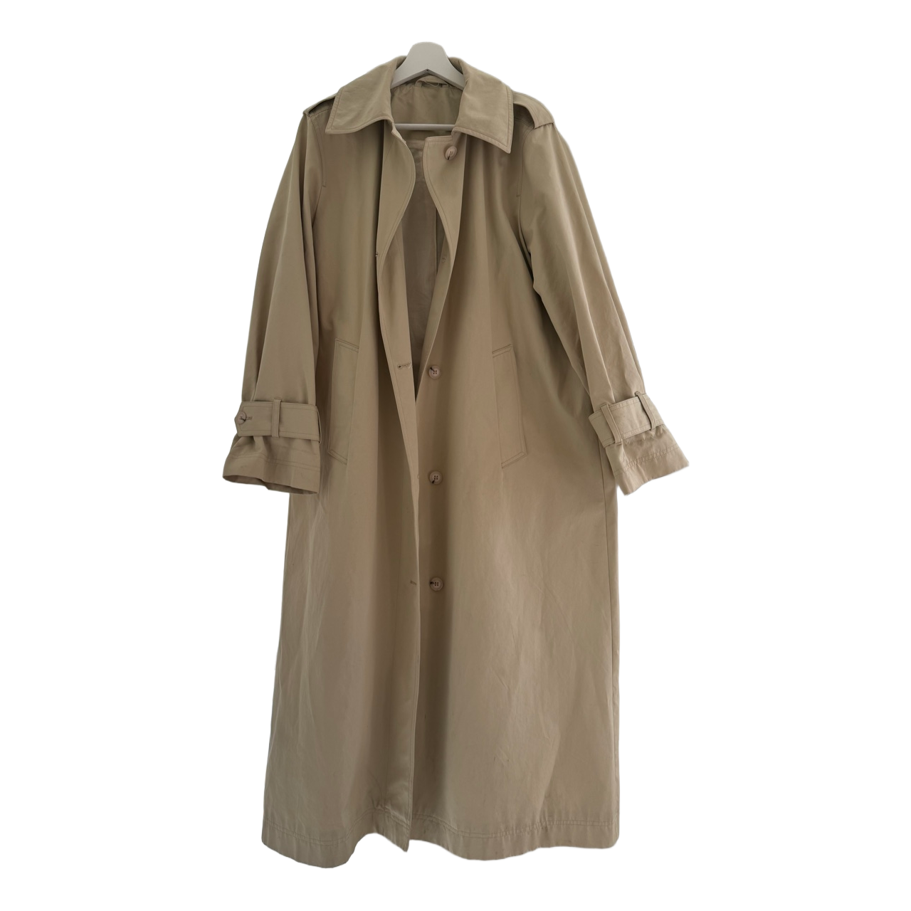 Long beige trench coat with button closure, belt, and adjustable cuffs.