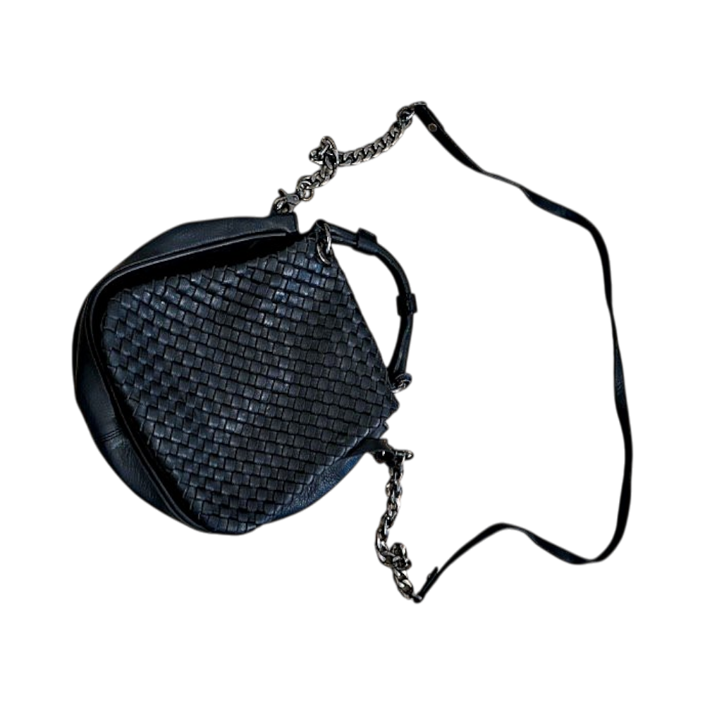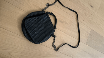 Knitted detailing and chain shoulder strap. Zipper fastening and spacious interior.