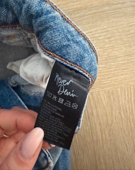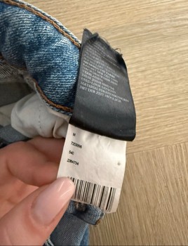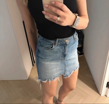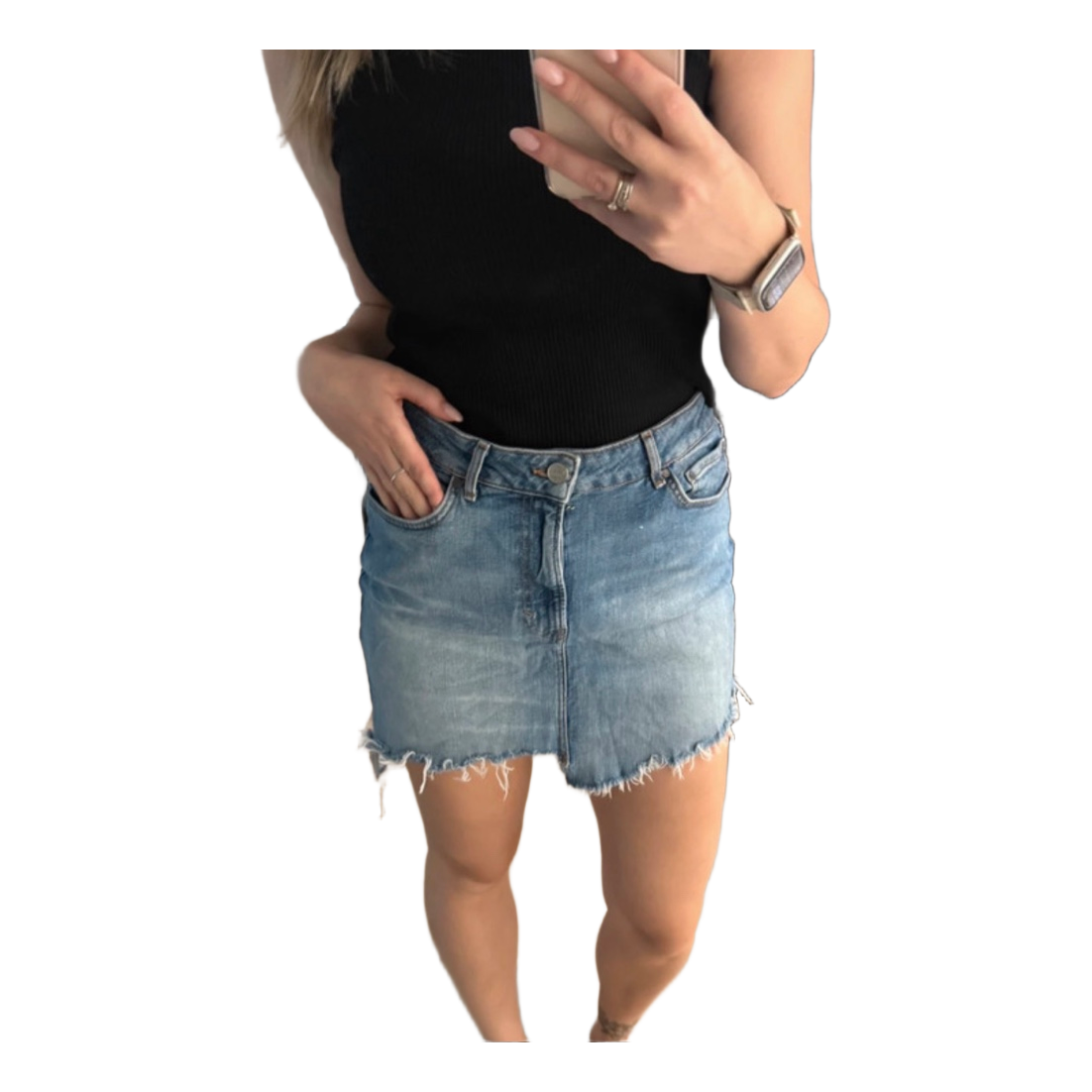 Denim skirt with a raw, frayed hem. Classic five-pocket style, size M.