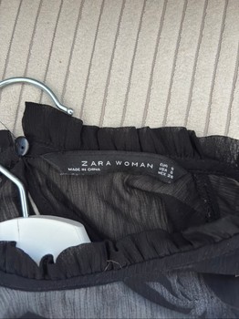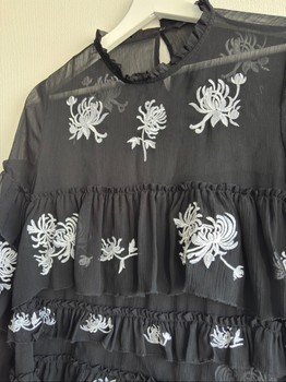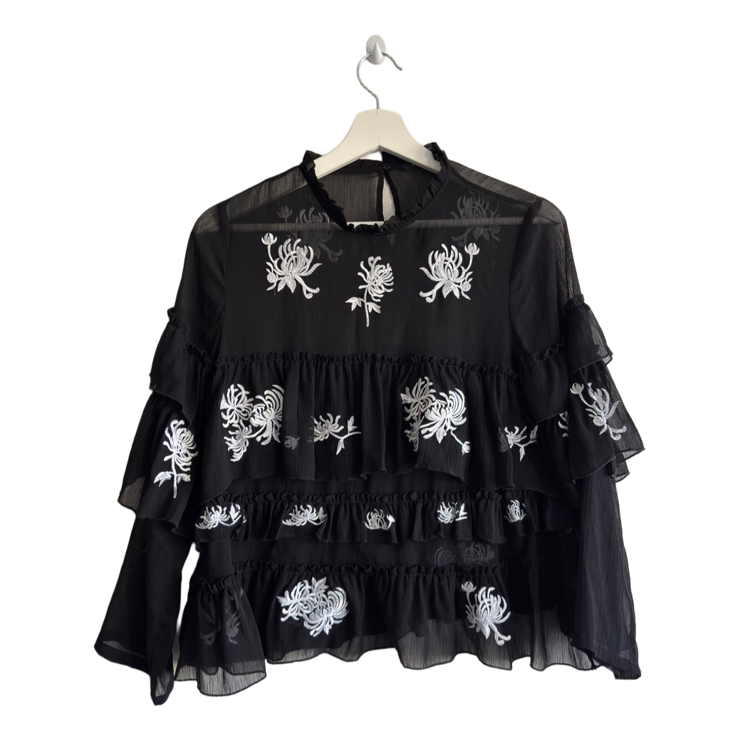 Black sheer blouse featuring white floral embroidery and layered ruffled details. Size S.
