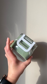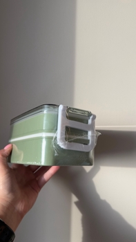 Mint-green lunch box with a transparent lid. The package includes a fork and a spoon. The box's sides have white clips.