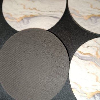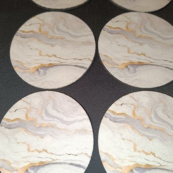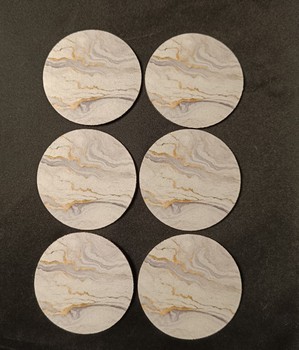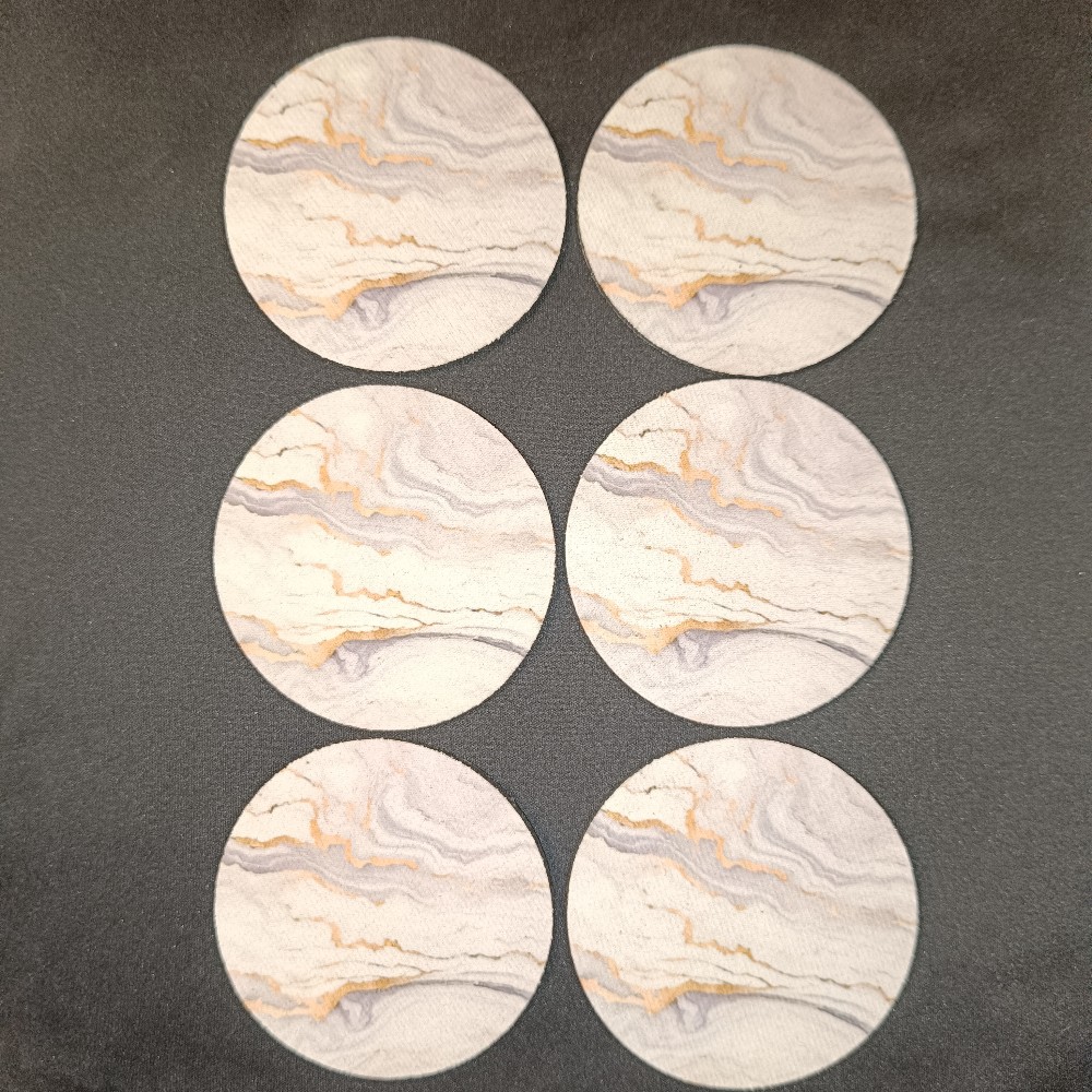 Set of round coasters featuring a beige marble pattern. They have a non-slip dark grey textured backing.
