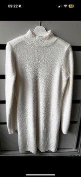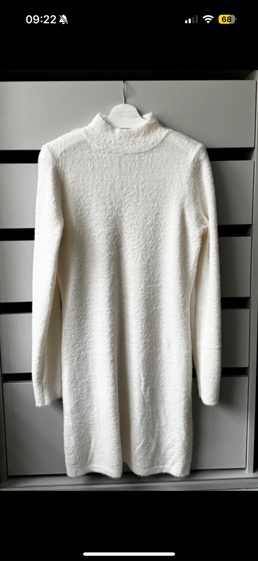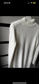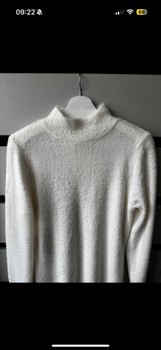 White long-sleeved knit sweater with a high neckline. Features a textured fuzzy fabric. Size XL.