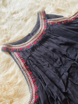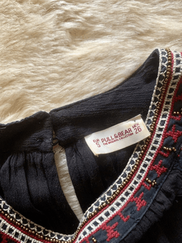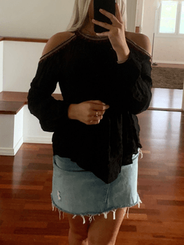 Lovely black blouse with open shoulders and embroidery at the neckline. Very little used.
