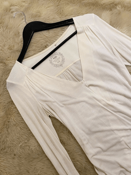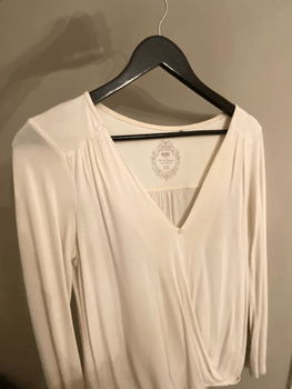 Beautiful white long-sleeved blouse. The fabrics cross over at the front, which looks really nice when worn. V-shaped neckline, size XS (also fits size S).