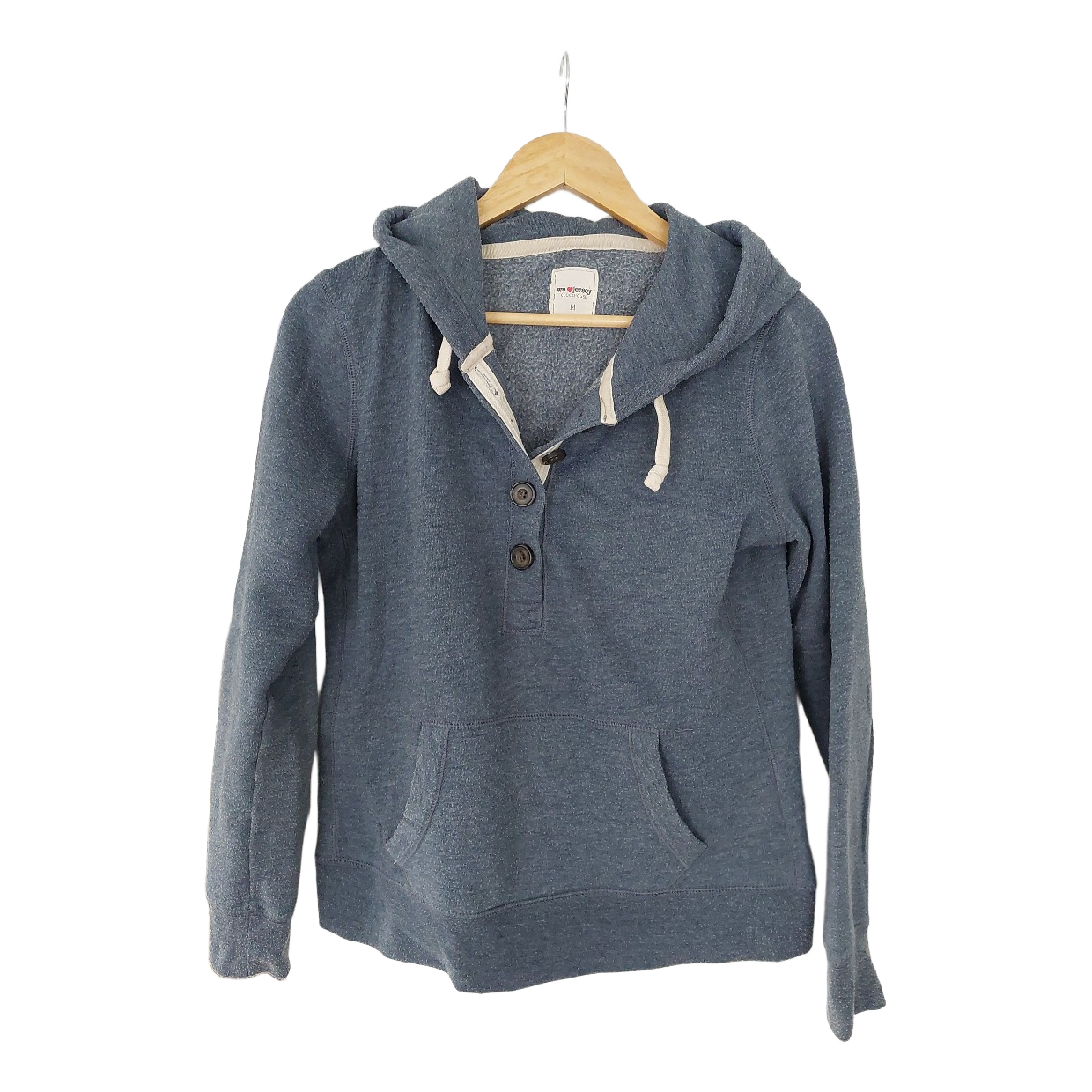 Blue hoodie with a buttoned neckline and front pocket. Features a hood with drawstrings. Size M.