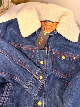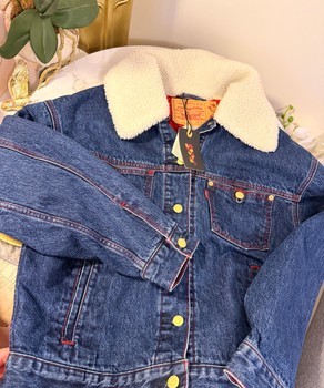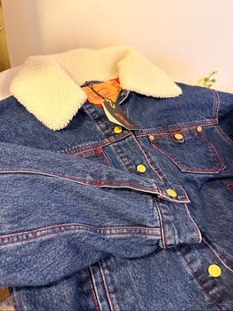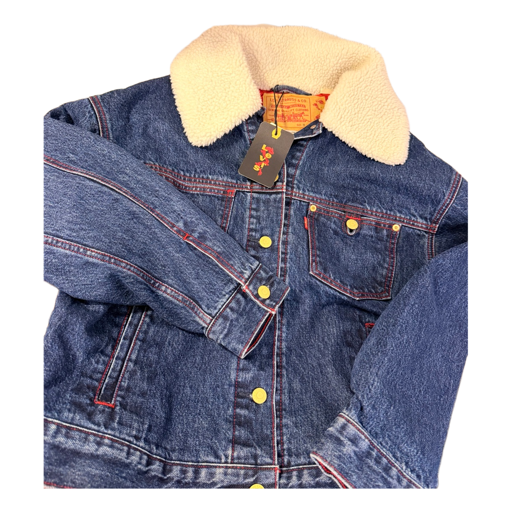 Blue denim jacket with a white sherpa collar and red interior lining. Features button-up front and chest pockets. Size M, new with tags.