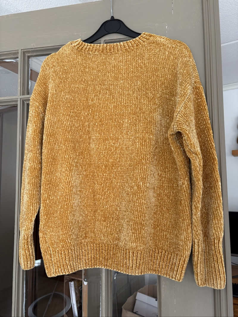 sinapinkeltainen neule, House Brand paita, samettimainen neule, syysneule, polyesteripaita, S-kokoinen paita, mukava neule, lämminsävyinen neule, sesonkiväri paita, pehmeä paita
