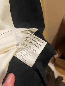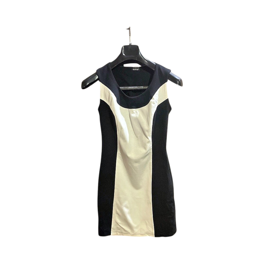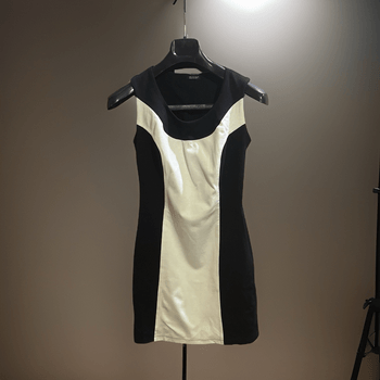 Dress featuring a black and white color block design with a round neckline. Made from a blend of viscose, nylon, and elastan.
