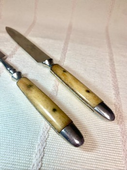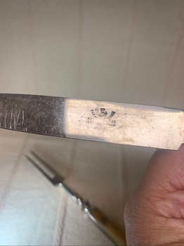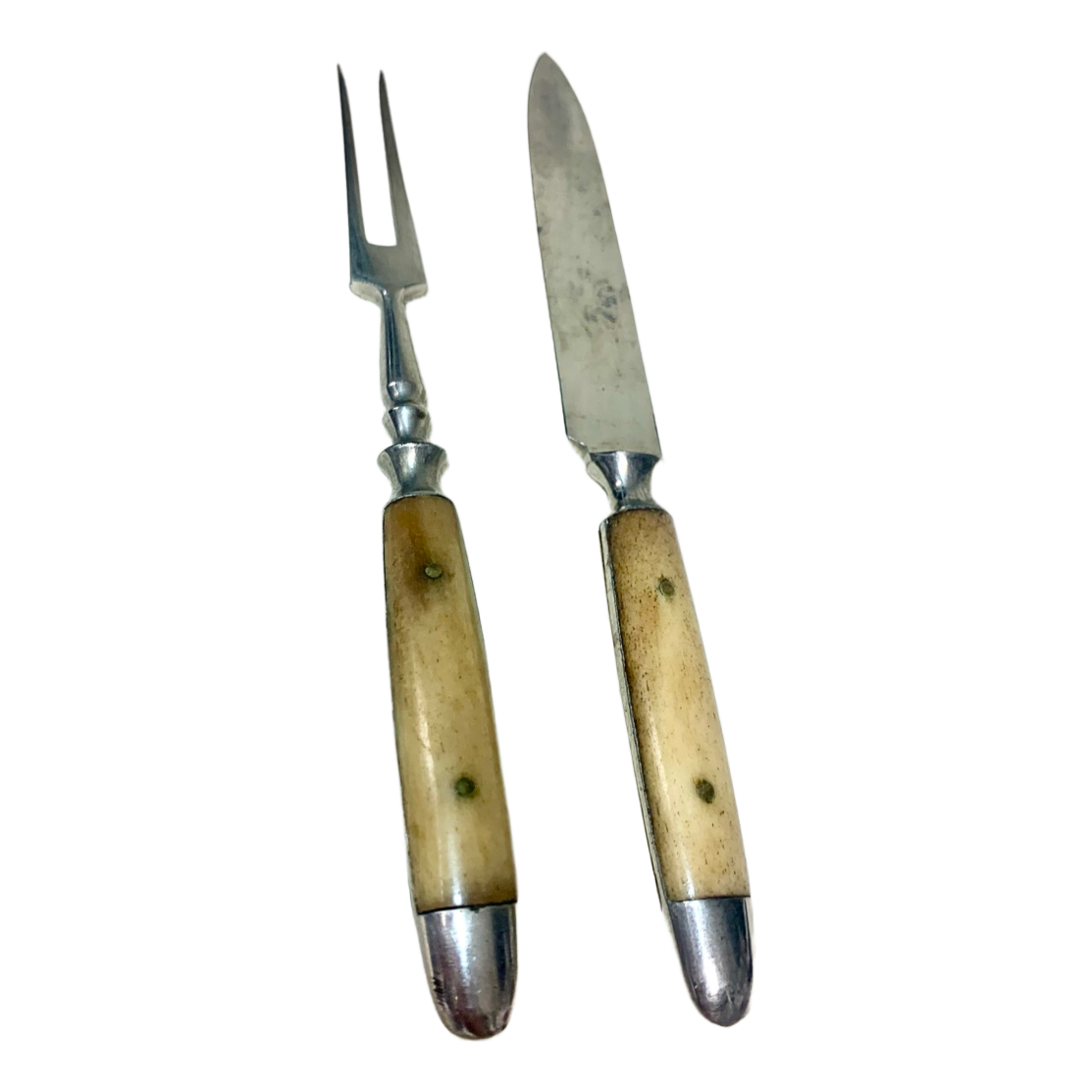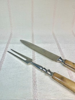 Vintage metal serving knife and fork set with light-colored handles. Features unique engraved markings on the blade.