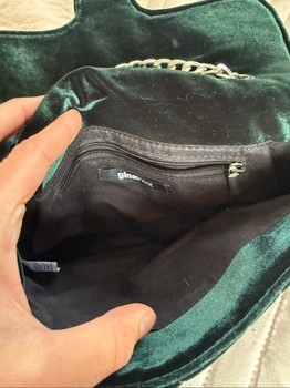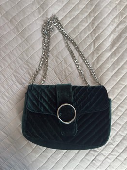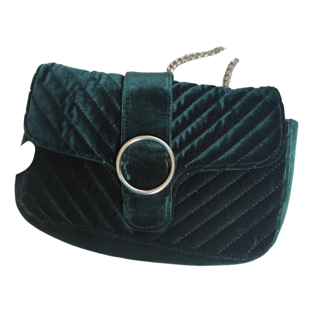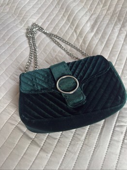 Small dark green velvet shoulder bag with quilted details and a metal chain strap. Features a circular magnetic closure. The metal buckle is scratched. The handbag no longer has its shape.