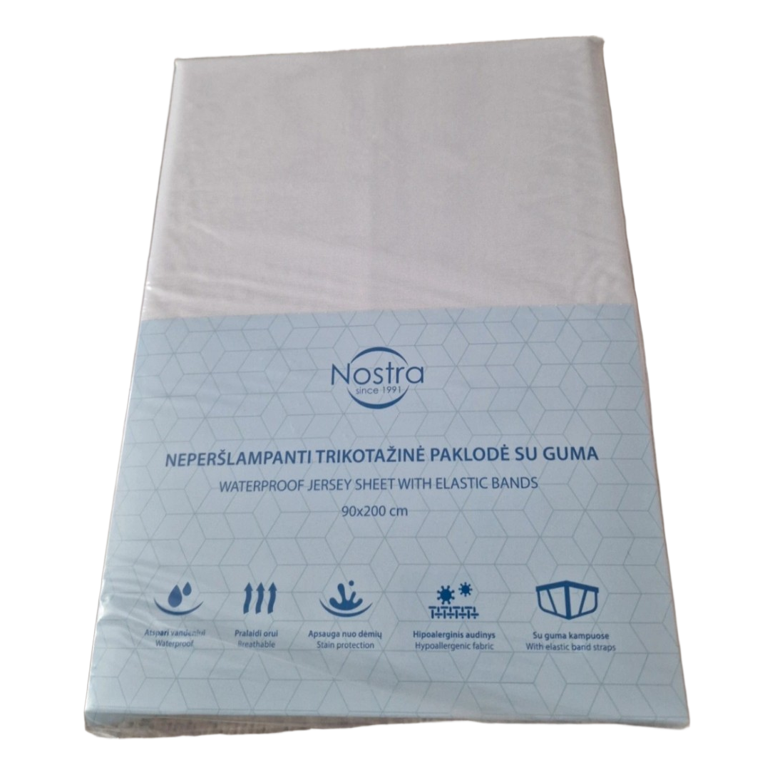 Nostra waterproof jersey fitted sheet, size 90x200 cm. Made of 100% polyester with a polyurethane backing.