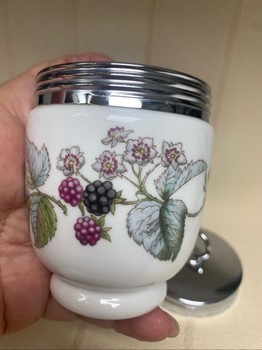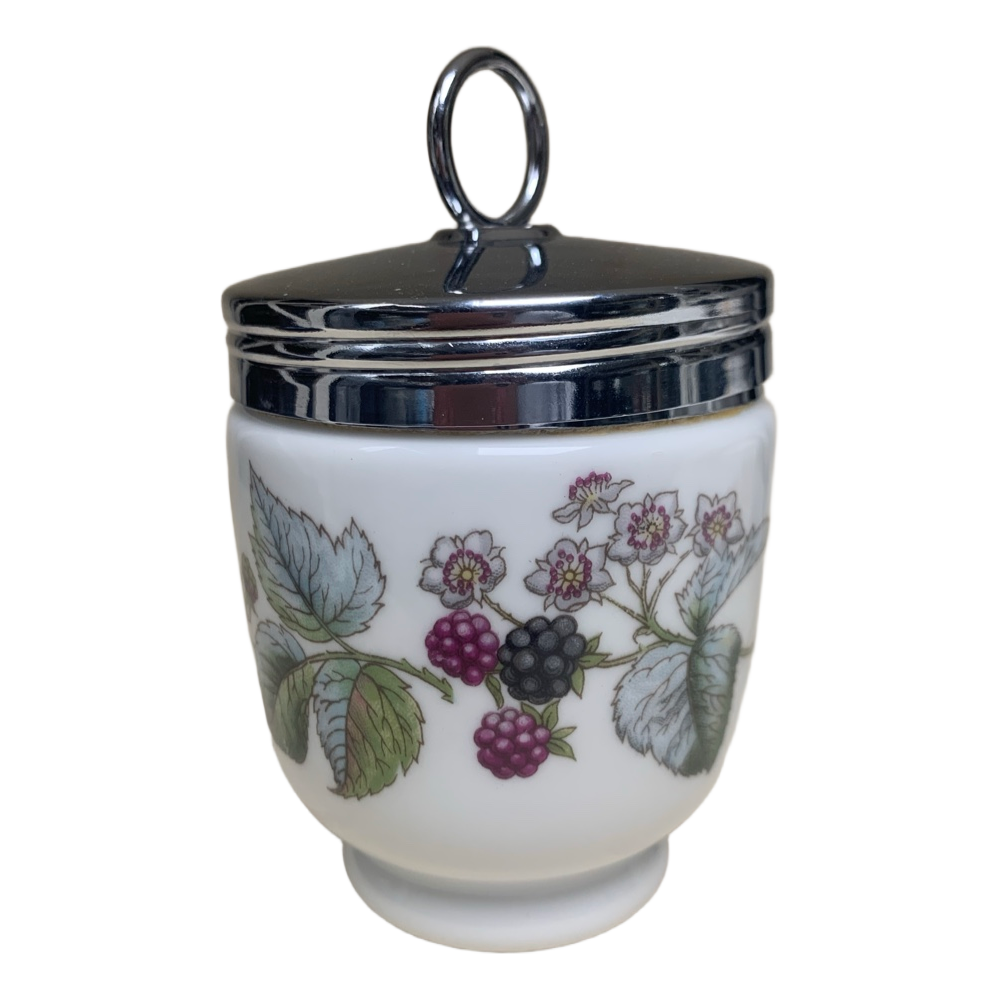 Small white porcelain coddler for 2 eggs decorated with blackberry pattern and chrome lid with ring handle. Produced by Royal Worcester in England.