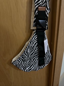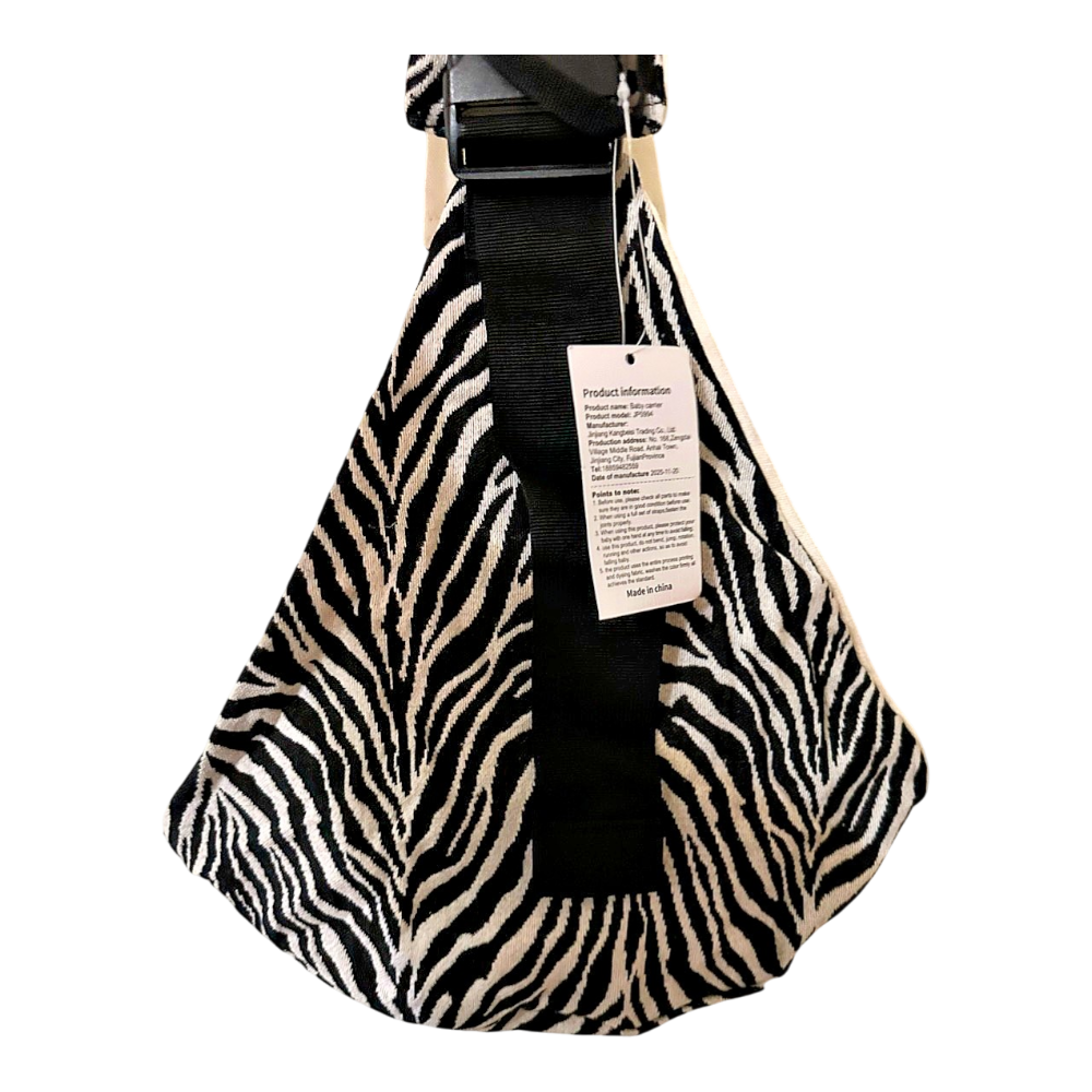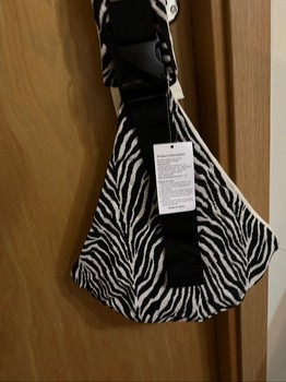 Mustvalge sebra mustriga õlakott. Kott on reguleeritava musta rihmaga. Tootel on küljes tooteinfo silt.