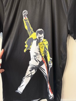 Black t-shirt featuring a Freddie Mercury graphic print. Made of polyester and spandex blend. Size M.