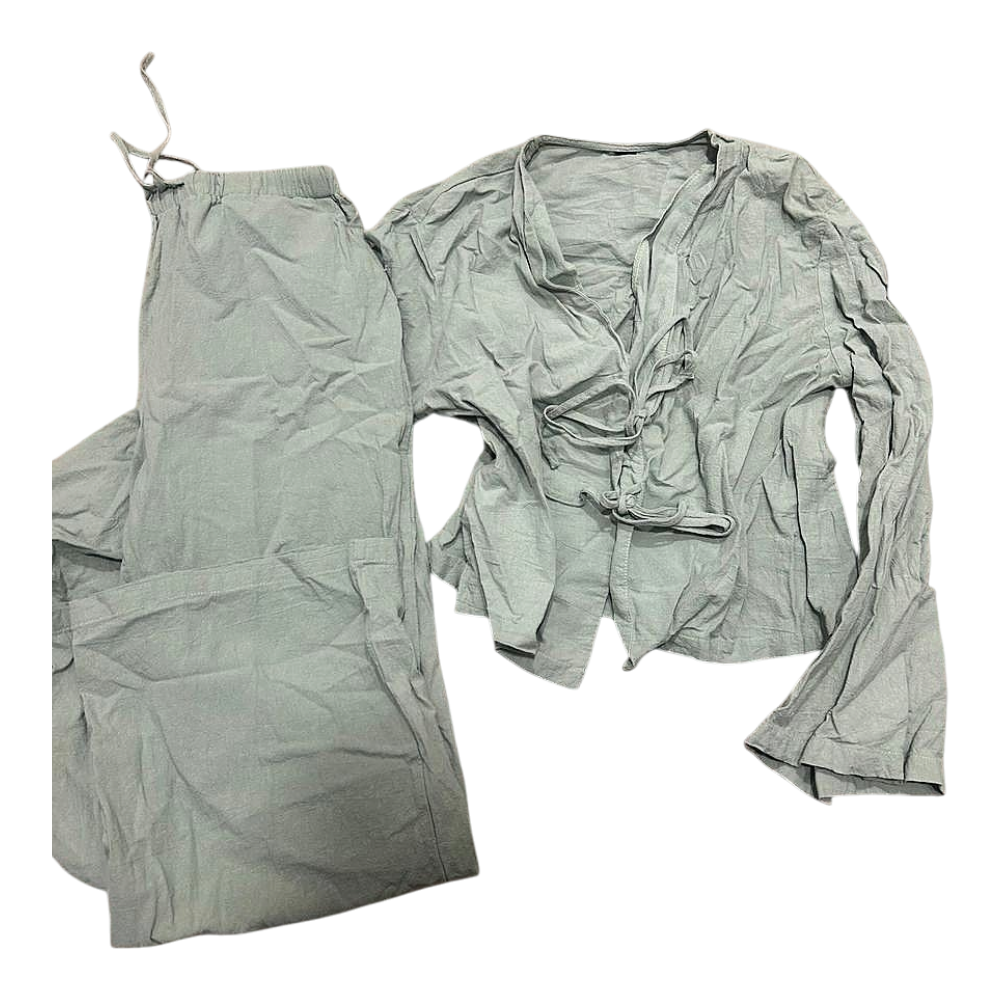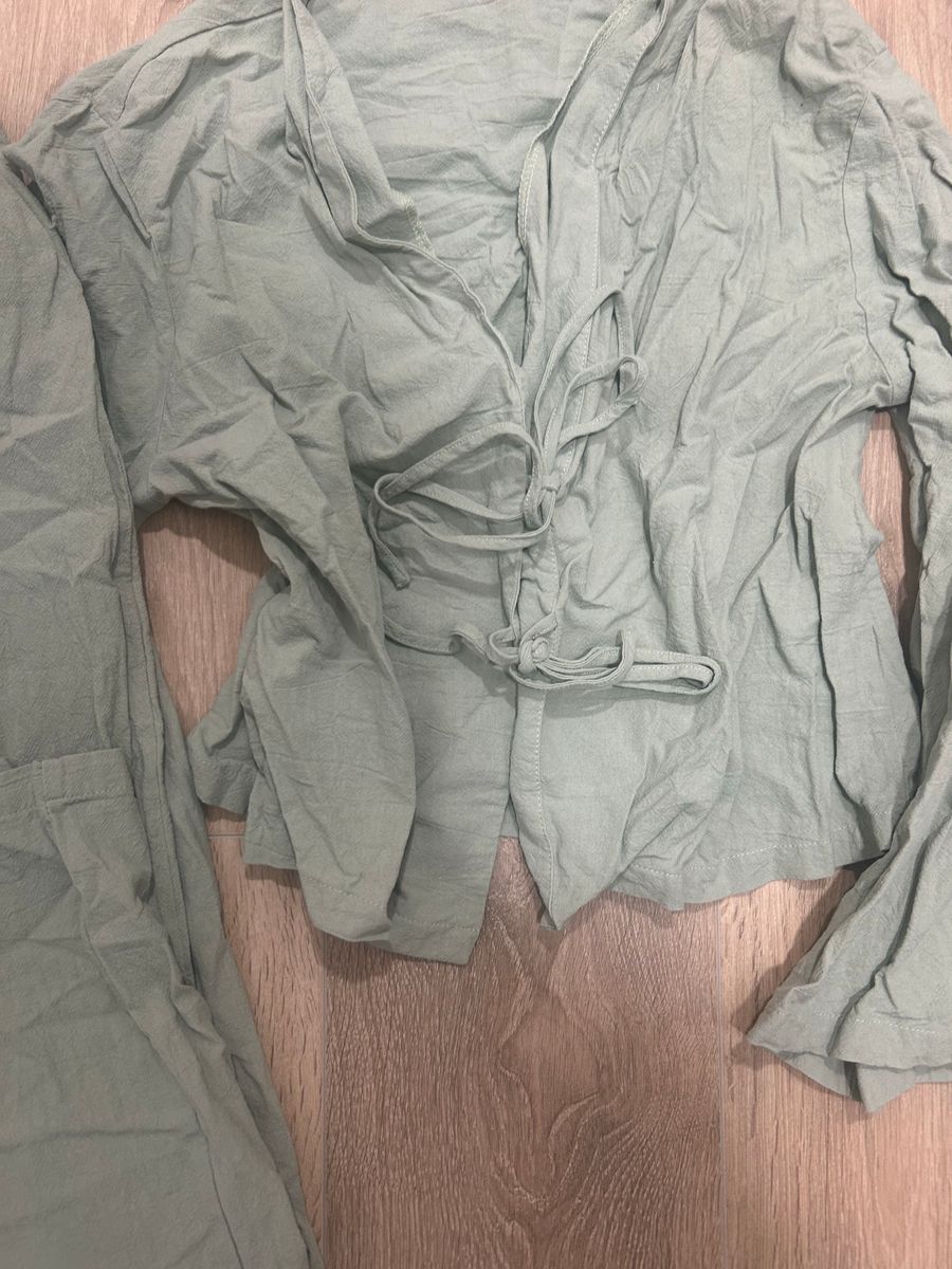 Mint green set, with a shirt that closes with ribbons and matching trousers.